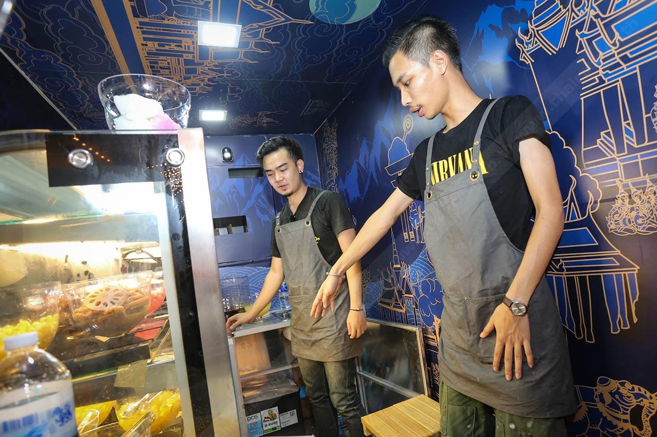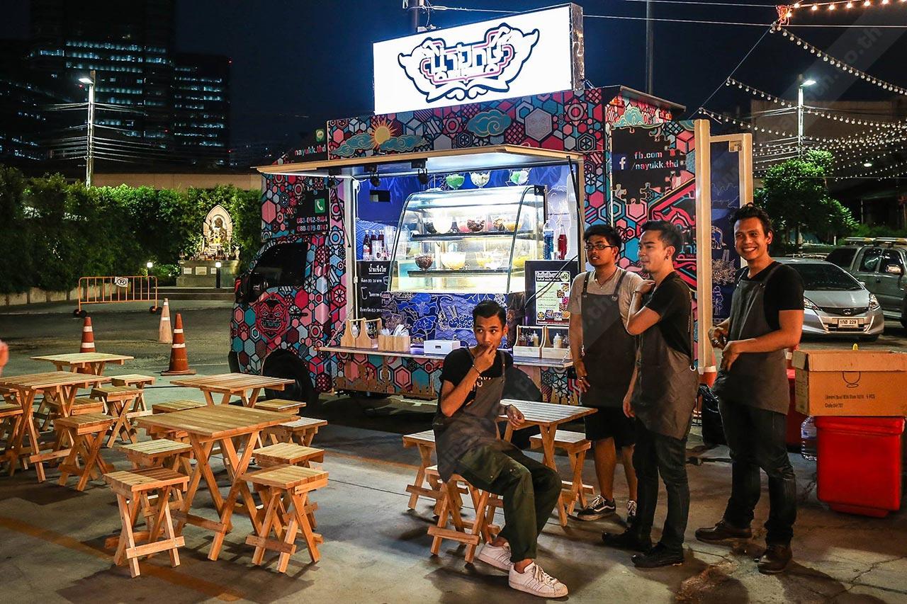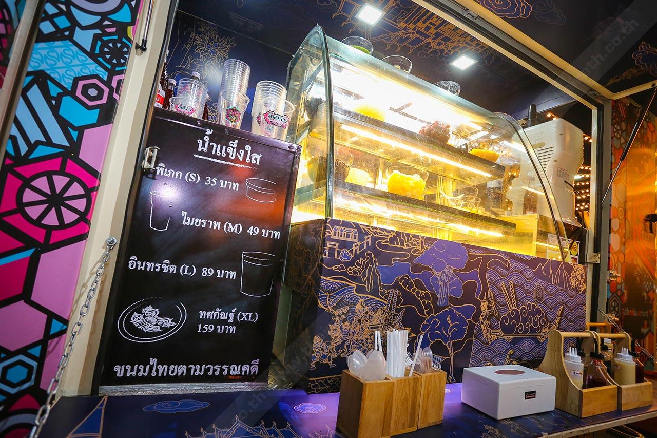 ซึ่งก็มาจบที่ขนมไทยสมัยโบราณ ที่เป็นของหวานแบบถ้วยๆ ราดน้ำกะทิ ใส่เครื่องพวกลอดช่อง เฉาก๊วย ทับทิมกรอบ ก็เลยโยงมาถึงการออกแบบลวดลายของรถ เราใช้ตัวยักษ์มาเป็นสัญลักษณ์เด่นของทางร้าน ผมว่ามันแสดงถึงความเป็นเมืองไทยเราได้ดีที่สุด พอลูกค้าเห็นยักษ์ก็เก็ตเลยว่าร้านนี้ต้องขายอาหารหรือขนมแบบไทยๆ แน่นอน