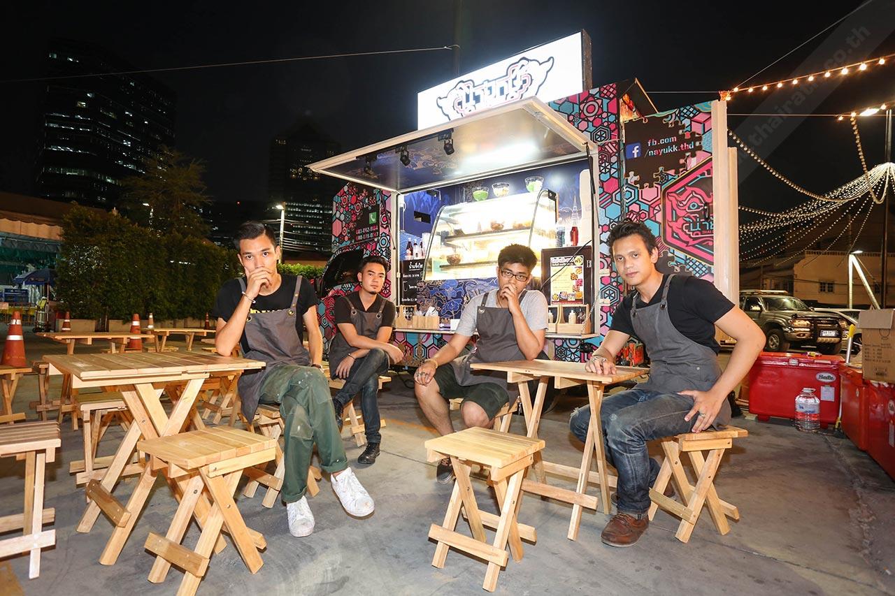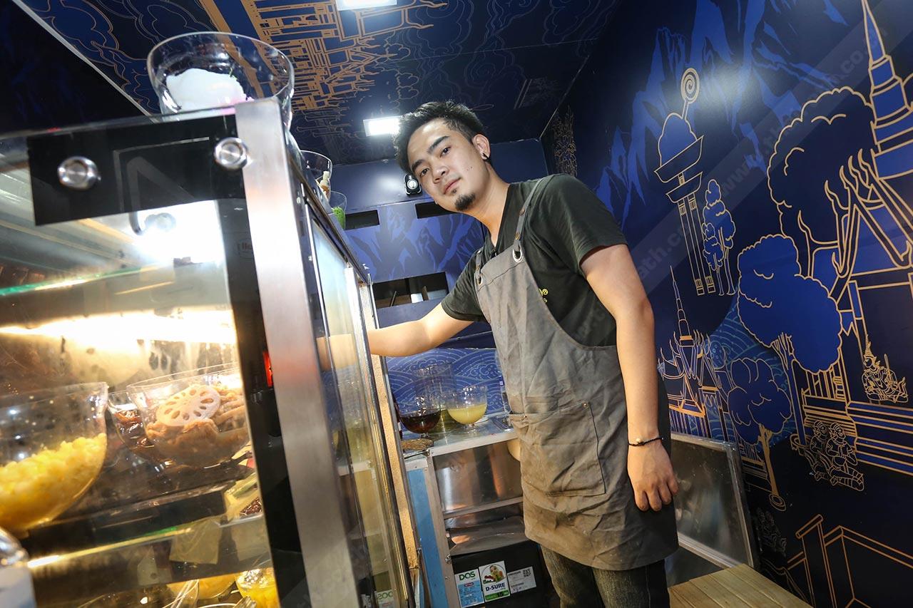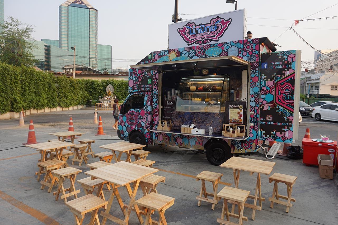 ซึ่งก็มาจบที่ขนมไทยสมัยโบราณ ที่เป็นของหวานแบบถ้วยๆ ราดน้ำกะทิ ใส่เครื่องพวกลอดช่อง เฉาก๊วย ทับทิมกรอบ ก็เลยโยงมาถึงการออกแบบลวดลายของรถ เราใช้ตัวยักษ์มาเป็นสัญลักษณ์เด่นของทางร้าน ผมว่ามันแสดงถึงความเป็นเมืองไทยเราได้ดีที่สุด พอลูกค้าเห็นยักษ์ก็เก็ตเลยว่าร้านนี้ต้องขายอาหารหรือขนมแบบไทยๆ แน่นอน
