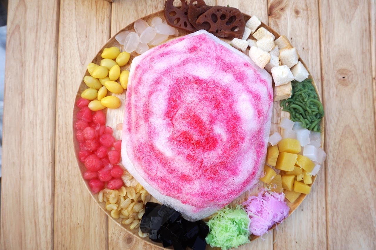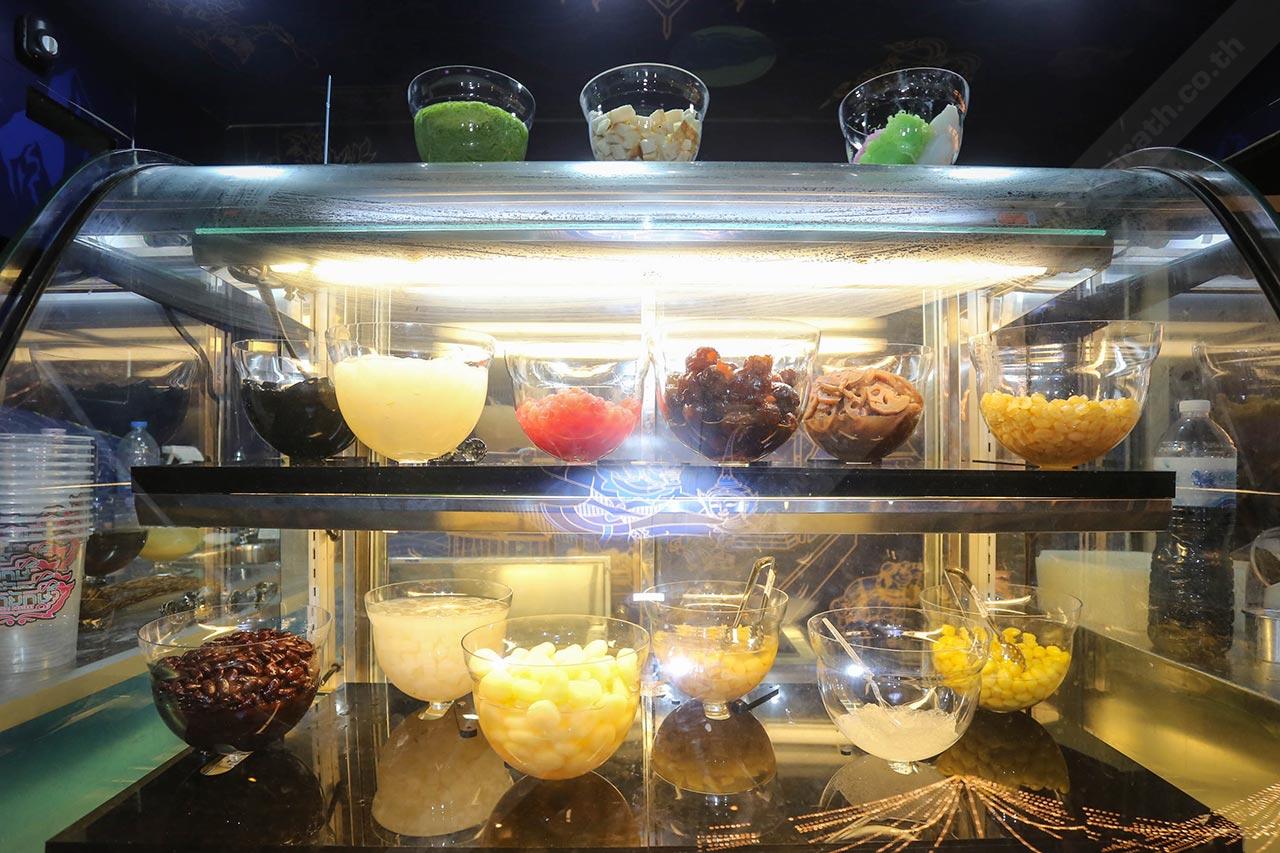 1. น้ำแข็งไสไทย ก็จะมีเครื่องต่างๆ ให้เลือกใส่ได้ เช่น ลอดช่อง เฉาก๊วย ทับทิมกรอบ ซาหริ่ม รากบัวเชื่อม ที่ทุกคนคุ้นเคยกันตั้งแต่เด็ก