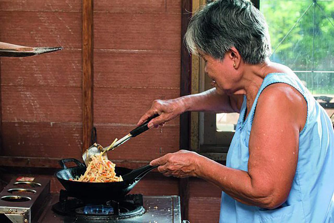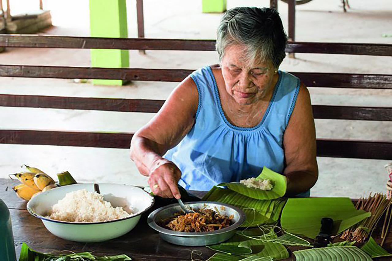 การห่อ ซ้อนใบตองสองชั้น ตักข้าวใส่ กดให้แบน แล้วตักไส้หน่อไม้ใส่ ก่อนจะตักข้าวทับอีกนิด แล้วทำการจัดให้แน่น จับจีบใบตองก่อนจะพับ แล้วเอาไปประกบคู่กัน จึงใช้ตอกมัดให้แน่นพอดี หากมัดหลวมไปหรือแน่นไปก็มีผลกับเมล็ดข้าว จึงต้องกะแรงให้พอดี เนื่องจากเมล็ดข้าวนั้นยังไม่สุก เมื่อนำไปนึ่งต่อ เมล็ดข้าวจะบานขึ้น ถ้าห่อแน่นไป นำไปนึ่งอาจทำให้ใบตองแตก หรือห่อหลวมไปตอกอาจจะหลุด พาลทำให้ใบตองหลุดตามไปด้วย และวิธีดูว่าข้าวต้มมัดที่นึ่งสุกหรือยัง ป้าสำรวยแนะให้สังเกตจากกลิ่นของกะทิและข้าวผสมผสานกับกลิ่นของใบตองหอมโชยออกมา แสดงว่าเครื่องด้านในเริ่มสุกแล้ว แต่ยังไม่ให้ยกลงทันที ต้องนึ่งไปอีกสักระยะก่อน จึงปลดลงจากเตา.