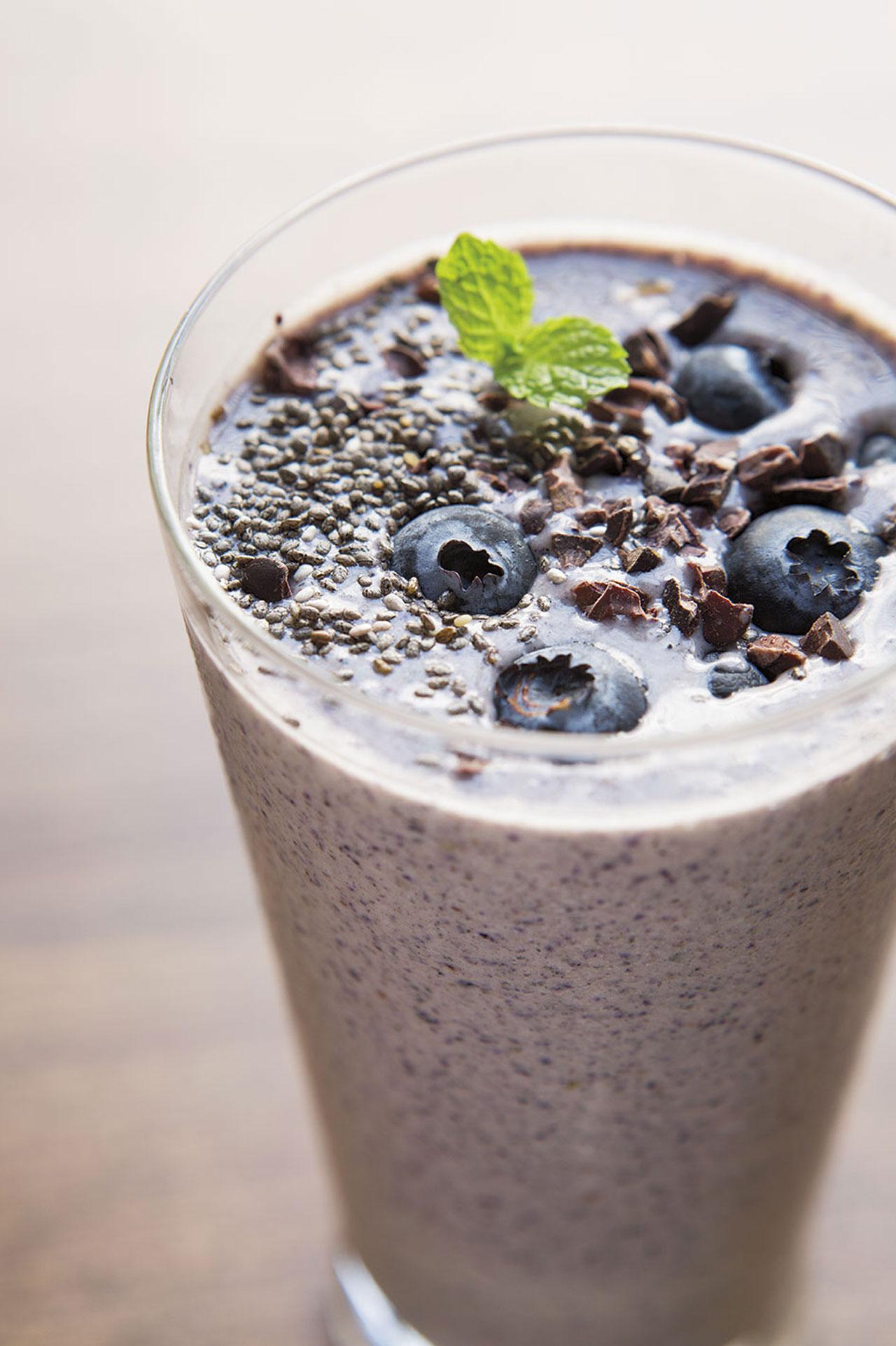 ปั่นส่วนผสมทุกอย่างเข้าด้วยกันจนละเอียด เทใส่แก้ว โรยหน้าด้วยบลูเบอร์รี่ เมล็ดเฟล็กซ์ และโกโก้นิป