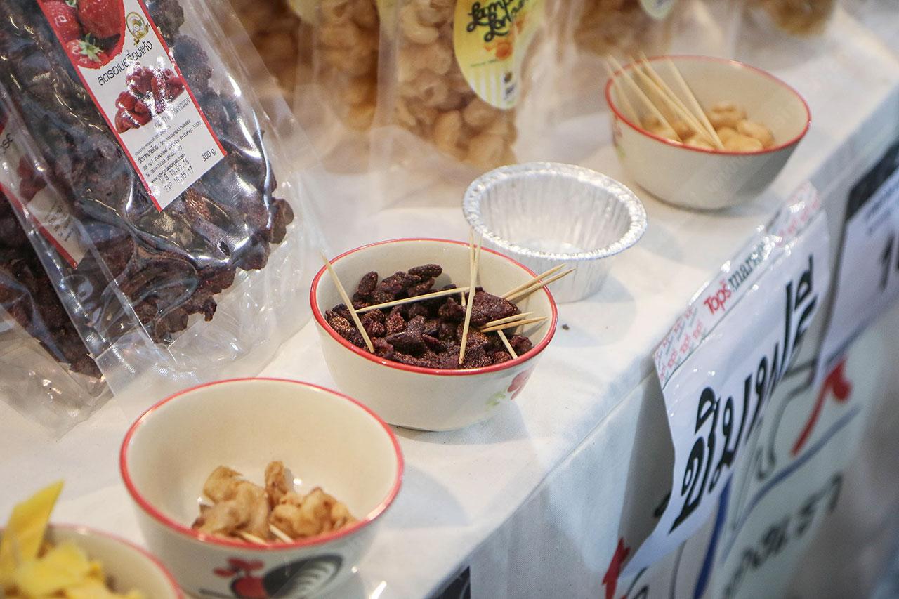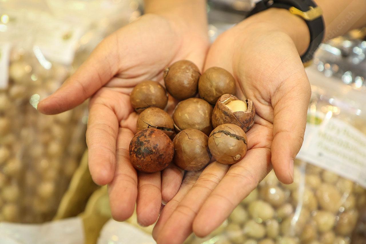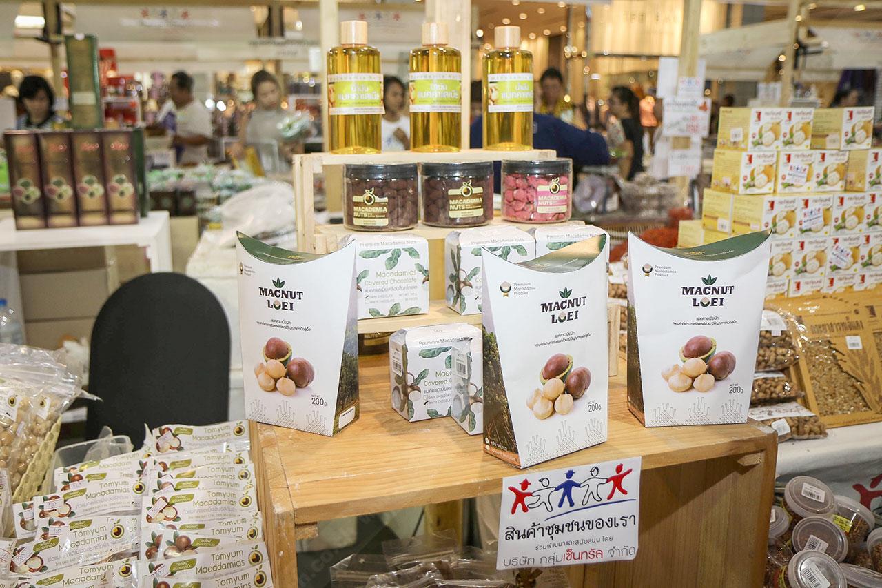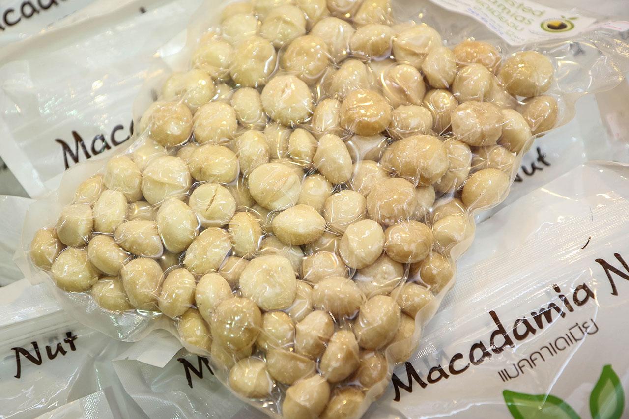 แมคคาเดเมียที่นี่ มีความพิเศษสุดๆ เพราะใช้เวลาปลูกยาวนานถึง 7 ปี แถมยังต้องคุมอุณหภูมิให้อยู่ที่ 30-35 องศาเซลเซียส และบริเวณที่ปลูกต้องอยู่สูงจากระดับน้ำทะเล 700 เมตร รสชาติจะอร่อยและมัน เพราะปลูกในสภาพอากาศที่เหมาะสม ไม่ต้องห่วงเลยว่าจะสู้แมคคาเดเมียของภาคเหนือไม่ได้ ภายในบูธมีทั้งแมคคาเดเมียอบเกลือ และแบบแปรรูปปรุงรสต่างๆ สนนราคาถุงเล็กอยู่ที่ 120 บาท ถ้าซื้อเป็นกิโลกรัมๆ ละ 700 บาท