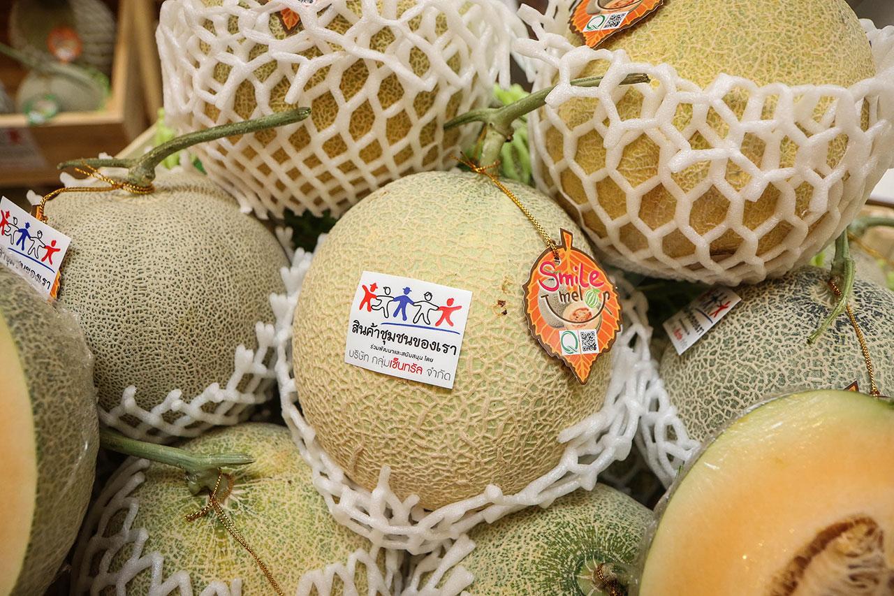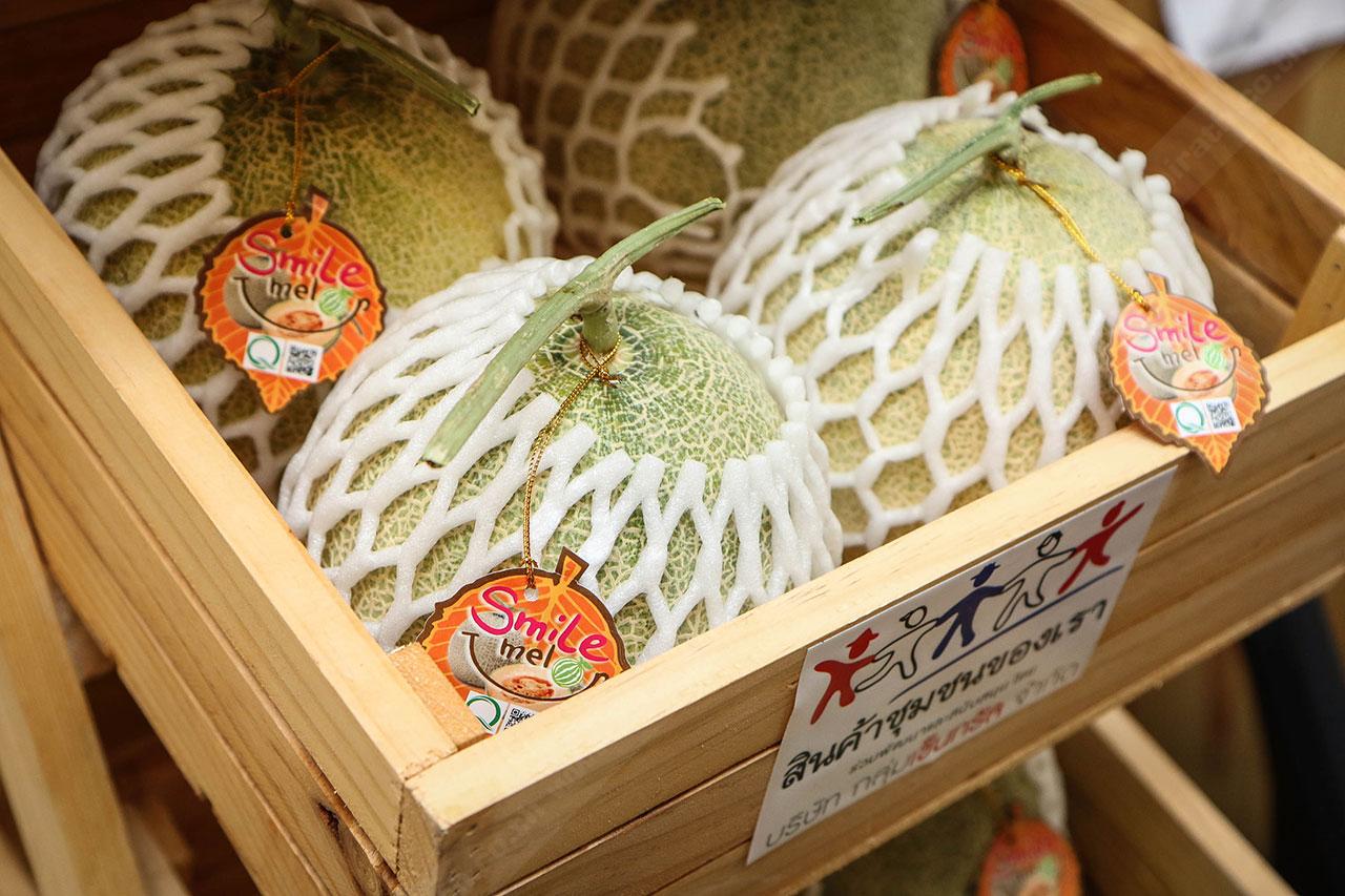 ที่นี่เขาปลูกอยู่ 2 สายพันธุ์ ได้แก่ เมล่อนเปลือกเขียว เนื้อมีสีส้ม หวานกรอบ และเมล่อนสีทอง เปลือกมีสีเหลืองทอง แต่เนื้อด้านในสีเขียว รสชาติจะหอมหหวาน เนื้อเนียนละเอียด สำหรับพันธุ์ที่นำมาออกบูธ เรียกว่า พันธุ์ 115 เนื้อสีส้ม หวานกรอบ หวานเข้มๆ เนื้อไม่เละ โปรโมชั่น กิโลละ 119 บาท น้ำหนักลูกละประมาณ 2-4 กิโลกรัม พี่ๆ เขาปลูกในโรงเรือนมาตรฐาน ไม่มีเชื้อรา ได้ผลผลิตปีละ 3 ครั้ง