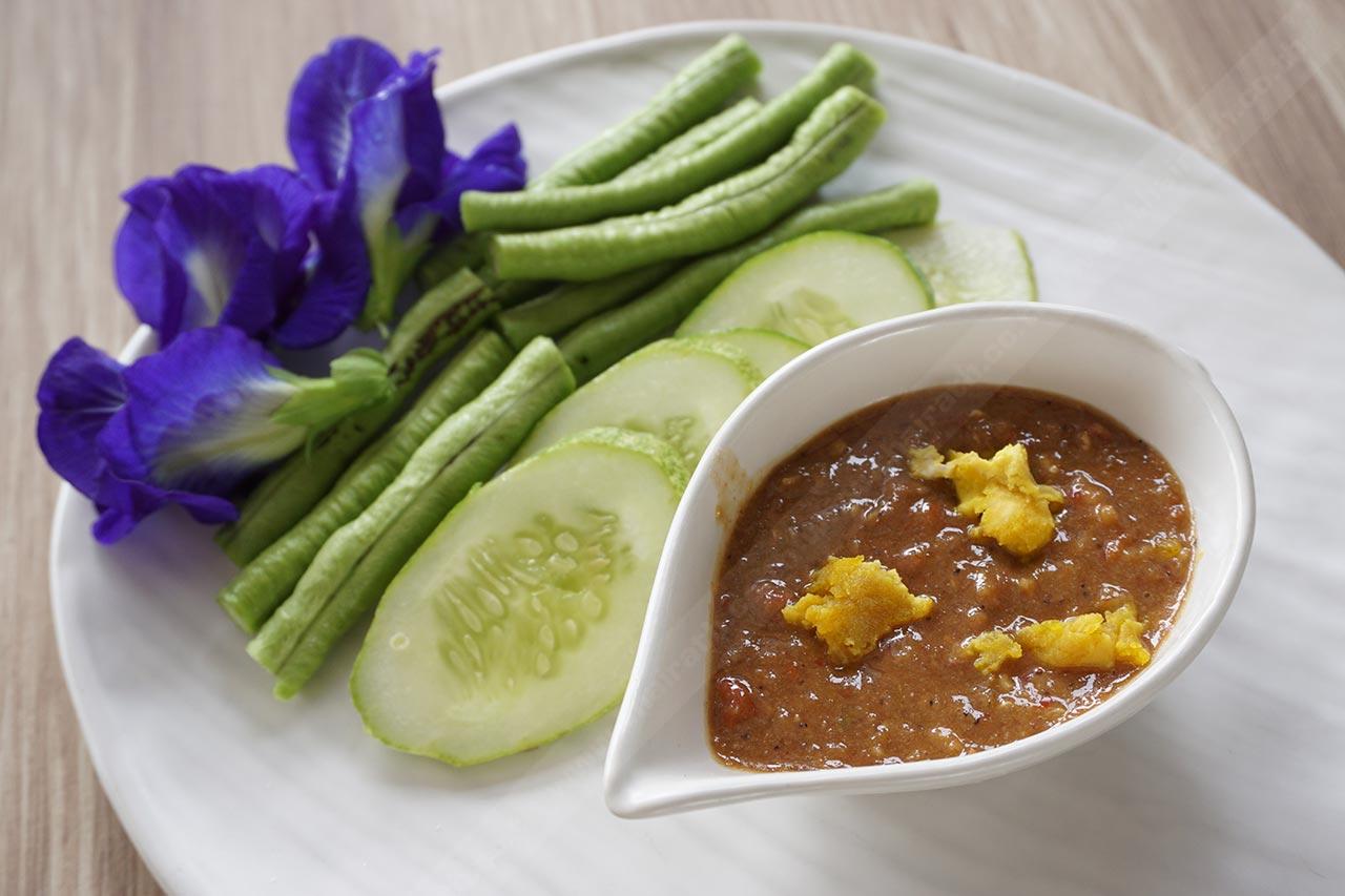 ปิดท้ายกันที่เมนูเครื่องจิ้มอย่าง น้ำพริกกะปิ สูตรเด็ดของที่นี่คือใส่ไข่แดงของไข่เค็มลงไปด้วย เพิ่มความหอมมัน คลุกข้าวสวยร้อนๆ ทานพร้อมผักสด กรอบ อร่อย สะอาด จากไร่นี่เอง อร่อยฟินจนลืมอิ่ม