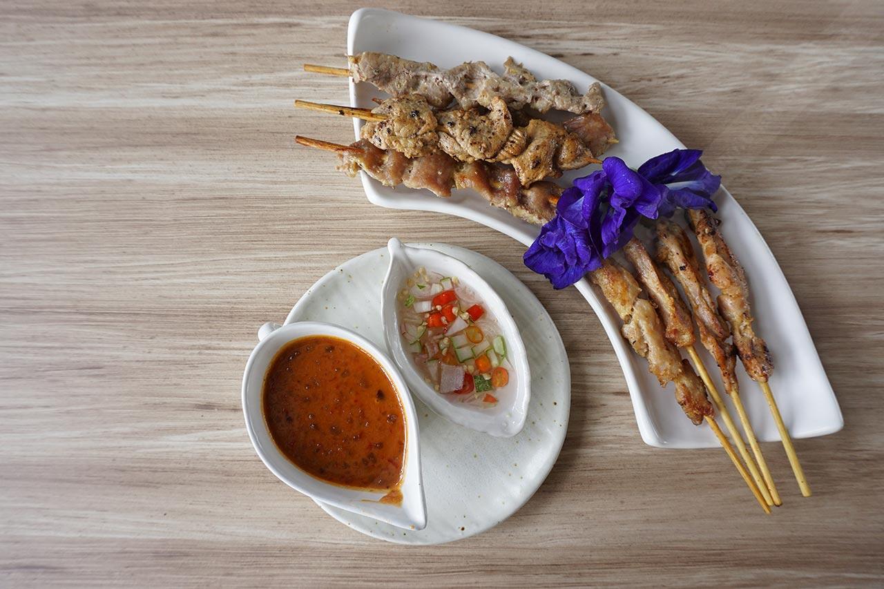 เมนูนี้เป็นหมูสะเต๊ะแบบบ้านๆ แต่รสชาติอร่อยเริด! เนื้อหมูนุ่มชุ่มฉ่ำ ย่างมาสุกกำลังดี ไม่ไหม้เหมือนบางร้าน ทานคู่กับน้ำจิ้มรสเด็ด และอาจาดที่มีผักสดๆ กรุบกรอบ ไร้สารเคมี ทานได้เต็มที่ได้อย่างสบายใจ