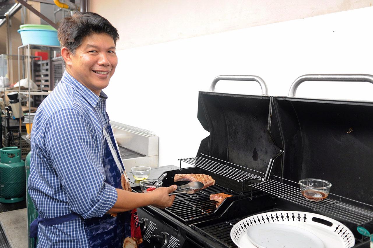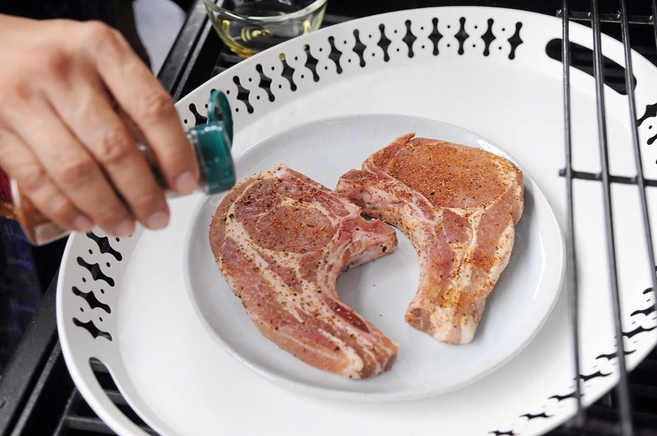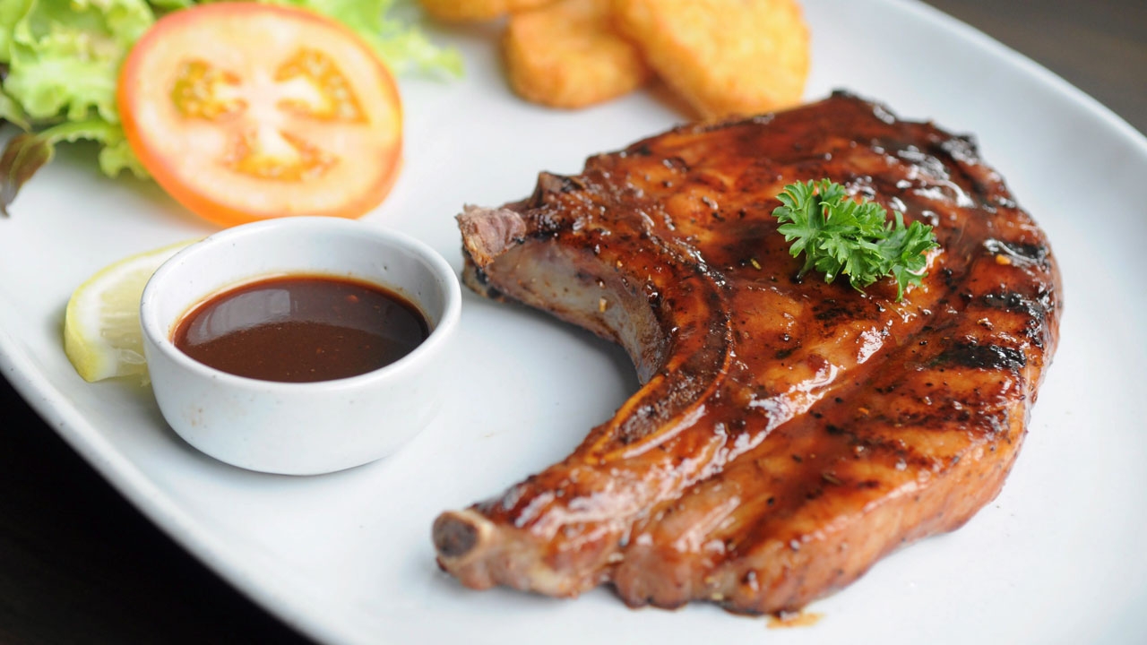 สำหรับสเต๊กหมู เลือก พอร์คช็อปเนื้อหมูคุโรบุตะ ติดกระดูกหนาประมาณ 1.5-2 เซนติเมตร นำมาคลุกเคล้ากับ ใบโรสแมรี่แห้ง, พริกไทยดำ, ออริกาโน่แห้ง, เมล็ดคึ่นช่ายฝรั่ง (Celery Seed) และ ผงปาปริก้า เป็นการเคลือบเครื่องปรุงต่างๆ ให้เข้าเนื้อ หมักทิ้งไว้ให้แห้งสักพัก ค่อยนำไปย่างไฟ เพื่อไม่ให้ชิ้นเนื้อสูญเสียน้ำ สำหรับเตาย่างให้เปิดไฟแรงจนกระทั่งควันขึ้น แล้วค่อยวางชิ้นเนื้อ ระหว่างย่างให้ปิดฝาครอบชิ้นสเต๊กและเปิดออกเป็นระยะ เพื่อกลับด้าน พร้อมเคล็ดลับ พรมน้ำแอปเปิ้ลบนพอร์คช็อป เพิ่มความนุ่มชุ่มฉ่ำและหวาน โดยพลิกกลับชิ้นหมูทั้ง 2 ด้านให้สีสม่ำเสมอกัน ประมาณ 3-4 ครั้ง เวลาสำหรับการย่างให้สุกก็ขึ้นอยู่กับความหนาของชิ้นสเต๊ก และเสียบเทอร์โมมิเตอร์ เพื่อวัดความสุกสำหรับสเต๊กหมู อุณหภูมิที่สุกสำหรับเนื้อหมูอยู่ที่ 150 -160 องศาฟาเรนไฮต์ นำสเต๊กหมูที่สุกแล้ว วางบนเตา ในส่วนที่ไม่โดนไฟโดยตรง และทาซอสบาร์บีคิวสไตล์เท็กซัสที่เตรียมไว้ทั้งสองด้าน นำลงจากเตา ทิ้งไว้ประมาณ 5-7 นาที เพื่อให้ไอน้ำคืนตัว เสิร์ฟคู่กับแฮชบราวน์ (มันบดทอด) หรือเลือกเสิร์ฟคู่กับมันบดก็ได้การันตีความอร่อย.