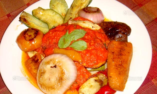 วิธีทำผักย่าง : นำพริกหวานที่หั่นไว้มาเรียงบนถาดแล้วทาน้ำมันมะ-กอกให้ทั่ว อบด้วยไฟสำหรับย่างอุณหภูมิ 220 องศา จนเปลือกไหม้และสุก นำออกจากเตา ใส่ถ้วยและปิดด้วยพลาสติกทันทีประมาณ 15 นาที จากนั้นค่อยลอกเปลือกออก ส่วนการอบมะเขือม่วง และซูกิ- นี่ ก็เช่นกัน นำผักทั้งสอง เรียงบนถาดแล้วทาน้ำมันมะกอก โดยอบประมาณ 5-8 นาทีจนกระทั่งนิ่ม ส่วนเห็ดให้พรมน้ำมันมะกอกเช่นกัน และนำเข้าอบประมาณ 5 นาที