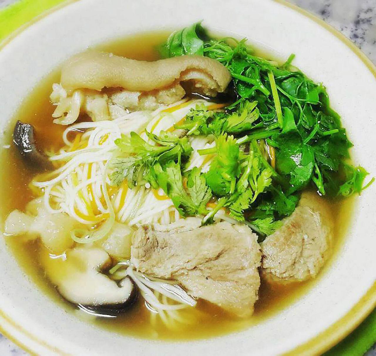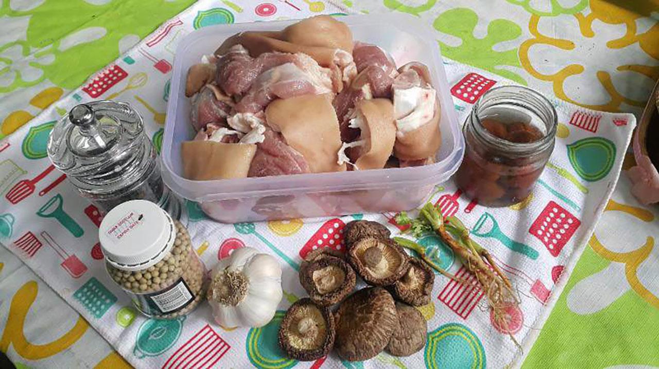 เครื่องปรุง : ขาหมู/เห็ดหอมหรือเยื่อไผ่/รากผักชี/ พริกไทยเม็ด/กระเทียม/บ๊วยดอง