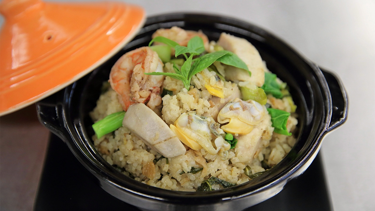 เครื่องปรุง : ข้าวสาร/เผือกหอม/กุ้งสด/เนื้อหมู/หอยลาย/ไชโป๊สับ/ผักคะน้าหั่น/ใบโหระพา/ผงพริกหอม/พริกไทยป่น/ซีอิ๊วขาว/ น้ำมันพืช.....วิธีทำ 1) นำกุ้งและเนื้อหมูที่หั่นพอดีคำไปหมักกับผงพริกหอม ซึ่งเป็นเคล็ดลับช่วยให้เมนูนี้หอมน่ารับประทานยิ่งขึ้น พร้อมด้วยพริกไทยป่น และซีอิ๊วขาว คลุกให้เข้ากันและหมักทิ้งไว้ให้เข้าเนื้อ 2) นำหอยลายไปแช่น้ำเกลือ เพื่อให้คลายดิน จากนั้นนำไปต้มในน้ำเดือด เมื่อหอยลายสุก นำมาแกะเอาแต่เนื้อหอยลาย 3) หั่นเผือกหอม (เลือกที่มีเนื้อร่วนและฟู) เป็นชิ้นสี่เหลี่ยมลูกเต๋า ขนาดไม่ต้องเล็กมาก 4) นำข้าวสารไปซาวน้ำให้สะอาด 5) นำน้ำที่ต้ม หอยลายมากรองตะกอนออก แล้วนำน้ำนั้นไปหุงข้าว โดยใส่เผือกที่หั่นเป็นลูกเต๋าหุงไปด้วย ส่วนน้ำใส่แค่ให้ท่วมเผือก เพื่อไม่ให้ข้าวแฉะเกินไป การใช้น้ำต้มหอยลายหุงข้าว เป็นอีกหนึ่งเคล็ดลับเด็ด ที่จะทำให้ข้าวและเผือกมีรสหวาน เมื่อข้าวหุงสุกแล้ว ให้ซุยข้าวให้ร่วนเพื่อไล่ความร้อนออกไป 6) นำของสดที่หมักไว้ลงผัดในกระทะ เริ่มจากเจียวไชโป๊สับให้หอม ตามด้วยกุ้ง หมู ที่หมักไว้ ใส่ลง ไปผัดให้พอสุก จากนั้นใส่หอยลาย และผักคะน้าหั่น ปรุงรสด้วยพริกหอมเล็กน้อย 7) ใส่ข้าวและเผือกที่หุงสุกแล้วลงไปผัดให้แห้ง แล้วใส่ใบโหระพา ผัดให้พอหอม ปิดไฟ โรยพริกไทย และผงอาวียองซ์ คอลลาเจน แมทริกซ์ เพื่อเพิ่มคุณค่าให้แก่อาหาร โดยคลุกเคล้าให้เข้ากัน พร้อมเสิร์ฟได้เลย