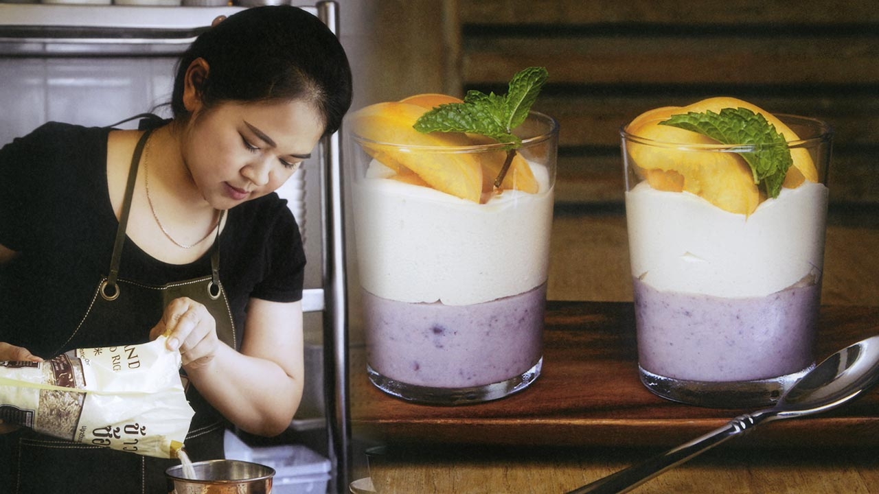 สำหรับส่วนผสม พุดดิ้งข้าวและถั่ว : ถั่วอะซูกิ 30 กรัม / ข้าวดอยซ้อมมือ 50 กรัม/กะทิ 150 กรัม/นมจืด 150 กรัม/น้ำตาล 50 กรัม/เกลือ 2 กรัม/เจลาตินชนิดแผ่น 4 กรัม/วิปปิ้งครีม 100 กรัม/พลัมสด/ใบมินต์.....