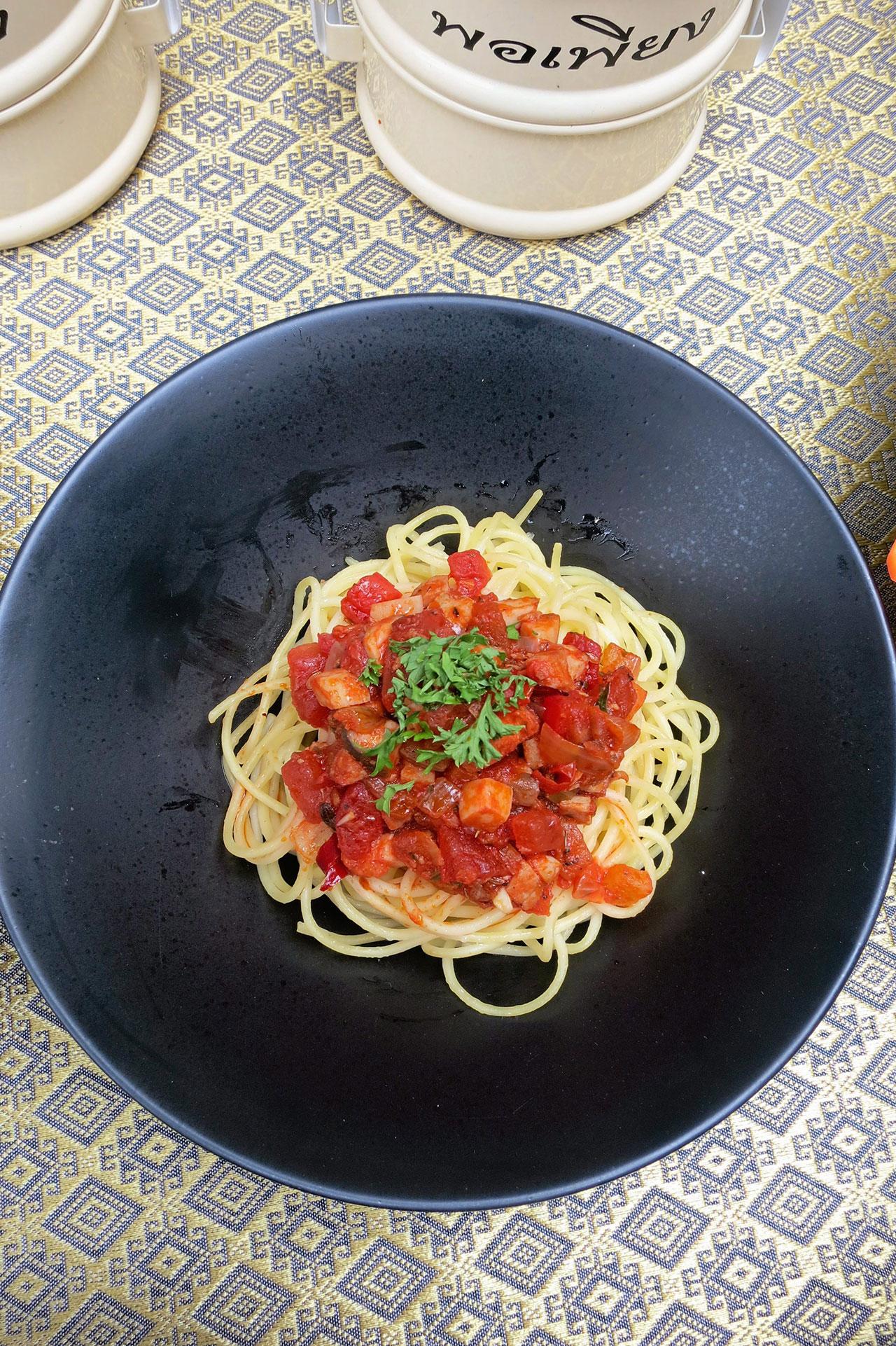 ส่วนเมนูต่อมาคือ สปาเกตตีมิลานเนส โดย เชฟเนตรอำไพ สาระโกเศศ กล่าวว่า สปาเกตตีมิลานเนส มีความหมายว่า สปาเกตตีสไตล์มิลาน ซึ่งมีส่วนประกอบหลักจากซอสที่ทำจากมะเขือเทศ และผักอื่นๆ ที่หาได้ในท้องถิ่น เช่น เดียวกับคนอิตาเลียน ซึ่งถือเมนูนี้เป็นอาหารหลักของคนจน เพราะใช้ส่วนประกอบจากผัก และมะเขือเทศที่ปลูกกันมากในประเทศอิตาลี แสดงให้เห็นถึงความสมถะของในหลวง รัชกาลที่ 9 ที่เสวยอาหารง่ายๆ ทรงชอบผักชนิดต่างๆ อาทิ แครอท มะเขือเทศ หอมใหญ่ เห็ด เบคอน โดย ผักและเครื่องปรุงชนิดต่างๆที่นำมาสาธิตนี้จะนำมาจากผักที่ปลูกจากโครงการหลวงทั้งสิ้น และมะเขือเทศนั้นเมื่อทานแล้วจะรู้สึกสดชื่น และมักจะโปรดเป็นเครื่องกลางวัน ซึ่งโดยส่วนตัวแล้วรู้สึกว่า พระองค์เสวยเพื่อให้มีกำลังทรงงานต่อ