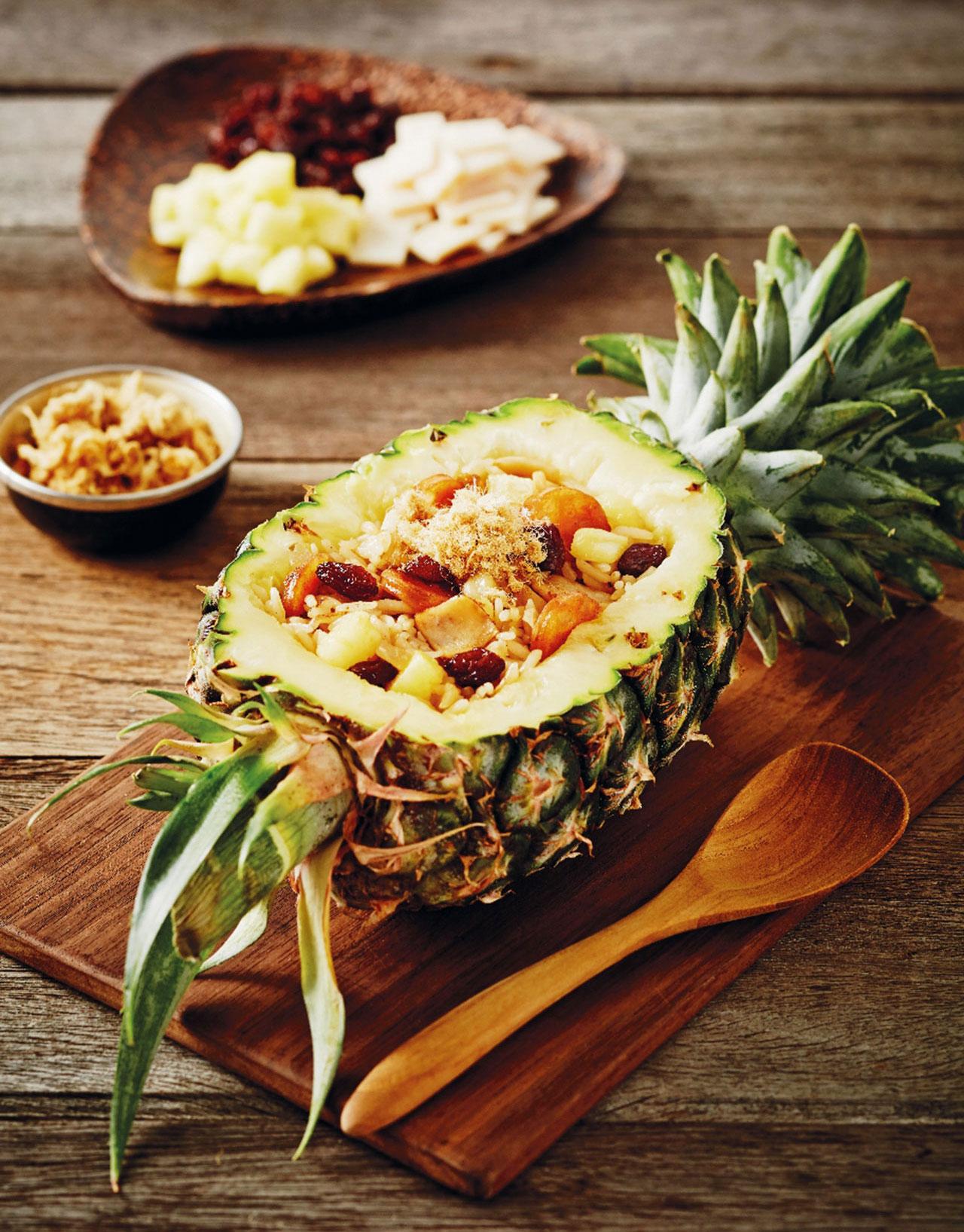 2. ตั้งกระทะใส่เนย พอร้อนใส่หอมหัวใหญ่ลงไปผัดพอสุกมีกลิ่นหอม จากนั้นใส่กุนเชียงและแฮมลงไปผัดพอสุก ใส่สับปะรดลงไปผัด พอส่วนผสมแห้งใส่ข้าวลงไป ปรุงรสด้วยซอสปรุงรส น้ำตาล และพริกไทย ผัดให้เข้ากัน เติมน้ำสับปะรดที่คั้นไว้ลงไป ผัดต่อจนส่วนผสมเริ่มแห้ง ใส่ลูกเกดลงไป ผัดพอเข้ากัน ปิดไฟ ตักข้าวผัดใส่ลงในสับปะรดที่คว้านไว้ทั้งสองชิ้น นำไปอบด้วยไฟบนล่างที่อุณหภูมิ 175 - 200 องศาเซลเซียส ประมาณ 15 - 20 นาที จนกระทั่งมีกลิ่นหอมและข้าวแห้งขึ้น นำออกมาโรยหน้าด้วยไก่หยองและผักชี พร้อมเสิร์ฟ