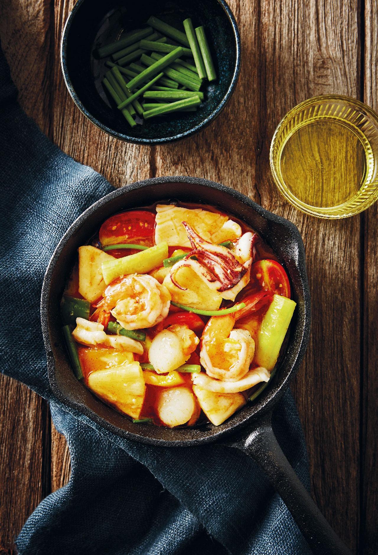 ตั้งกระทะใส่น้ำมัน พอร้อนใส่กระเทียมลงไป ผัดพอมีกลิ่นหอม ตามด้วยซีฟู้ดทั้งหมด พอเริ่มสุกใส่สับปะรดลงไปผัดพอมีกลิ่นหอม ปรุงรสด้วยซอสพริกซอสสับปะรด น้ำส้มสายชู น้ำตาล และเกลือ ผัดให้เข้ากัน ชิมรสให้ออกเปรี้ยวหวาน จากนั้นใส่พริกหวาน มะเขือเทศและแตงกวาลงไปผัดพอเข้ากันปิดไฟ ใส่ต้นหอมลงไปคลุกเคล้า ตักใส่จานเสิร์ฟ
