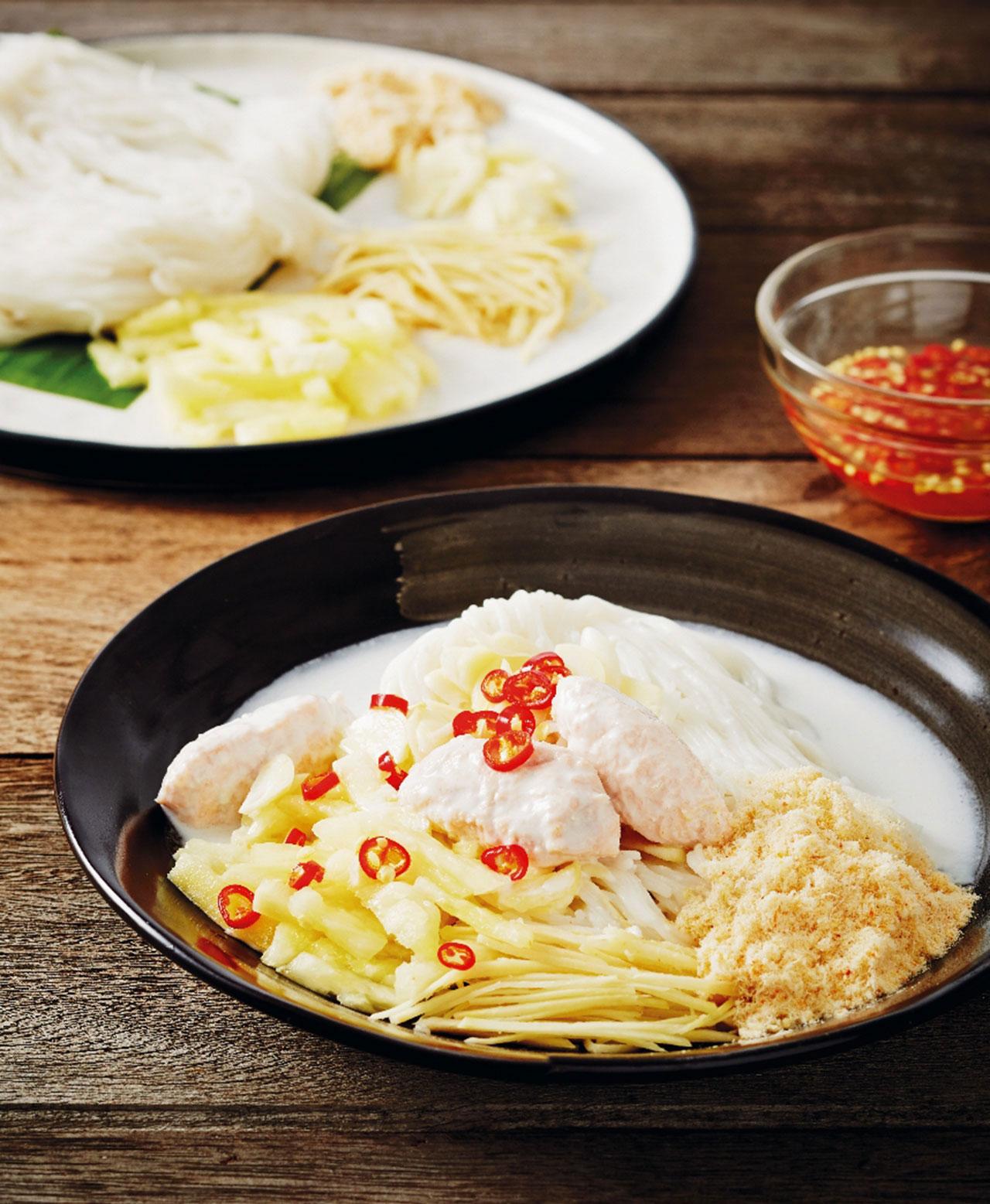 2. จัดขนมจีน สับปะรด ขิง กระเทียม กุ้งแห้งใส่จาน ตักแจงลอนกับน้ำกะทิราดลงไป ปรุงรสด้วยพริกน้ำปลา พร้อมรับประทาน