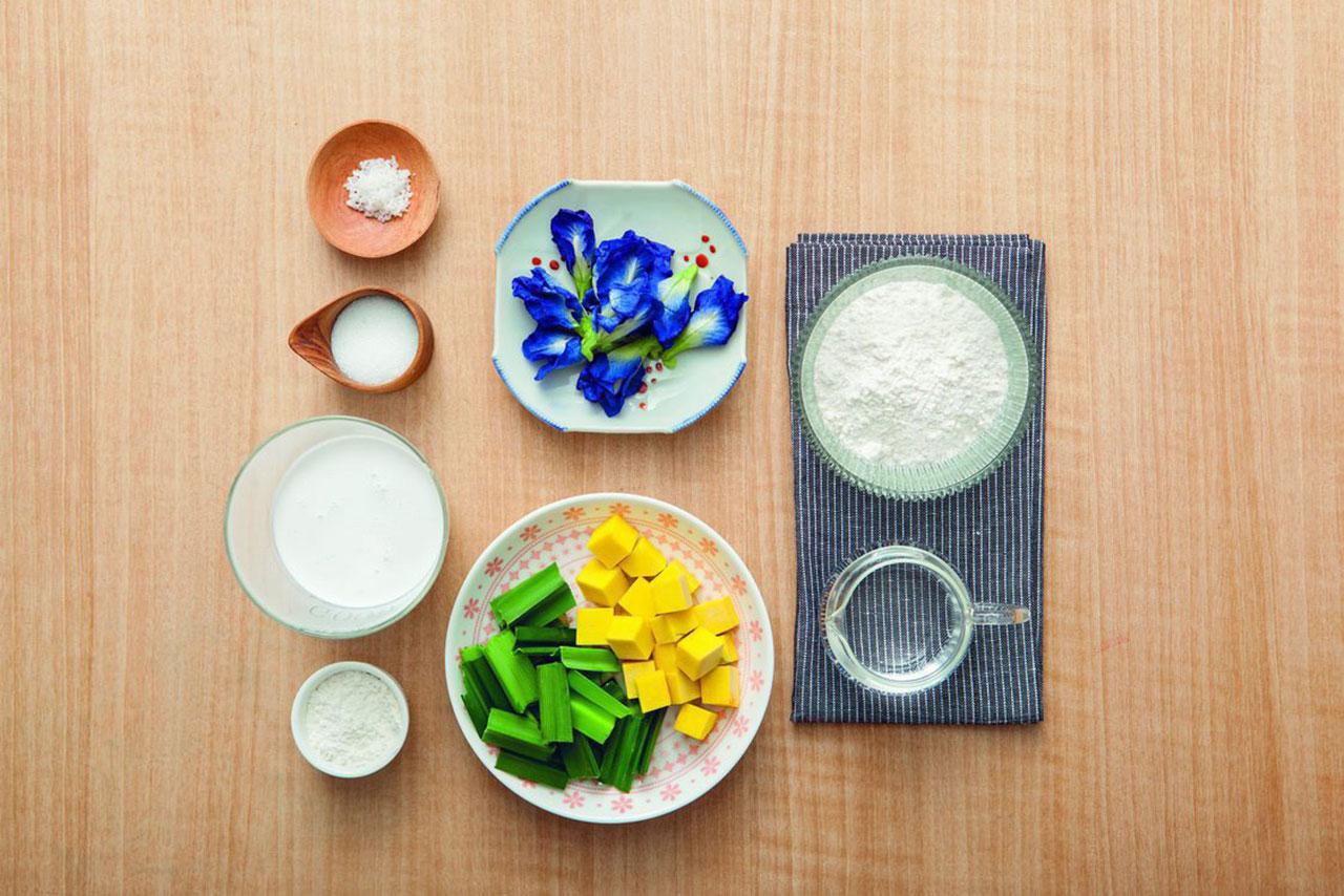 แป้งสีเขียว ประกอบด้วย แป้งข้าวเหนียว 20 กรัม/แป้งมัน 5 กรัม/น้ำใบเตย2 ช้อนโต๊ะ (ใบเตยหั่นหยาบ+น้ำ 3 ช้อนโต๊ะ),