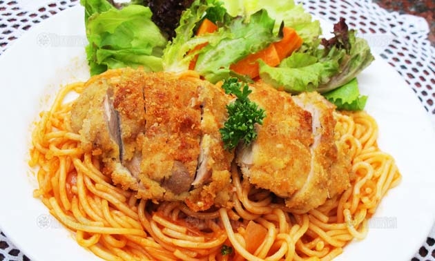 ใครที่ชอบหมูทอด "ทงคัตสึ" หรือหมูชุบเกล็ดขนมปังทอดนั่นแหละค่ะ แทนที่จะทานคู่กับข้าวสวยแบบเดิมๆ วันนี้มีไอเดียใหม่ๆจาก คุณน้อย-อัญชลี เทพหัสดิน ณ อยุธยา มานำเสนอค่ะ เธอทำไก่ชุบเกล็ดขนมปังทอดแบบทงคัตสึ แล้วเปลี่ยนไปทานคู่กับสปาเก็ตตี้แทน ซึ่งก็ได้รสชาติไม่ต่างกันค่ะ แต่แปลกและไม่ซ้ำซากจำเจอีกด้วย