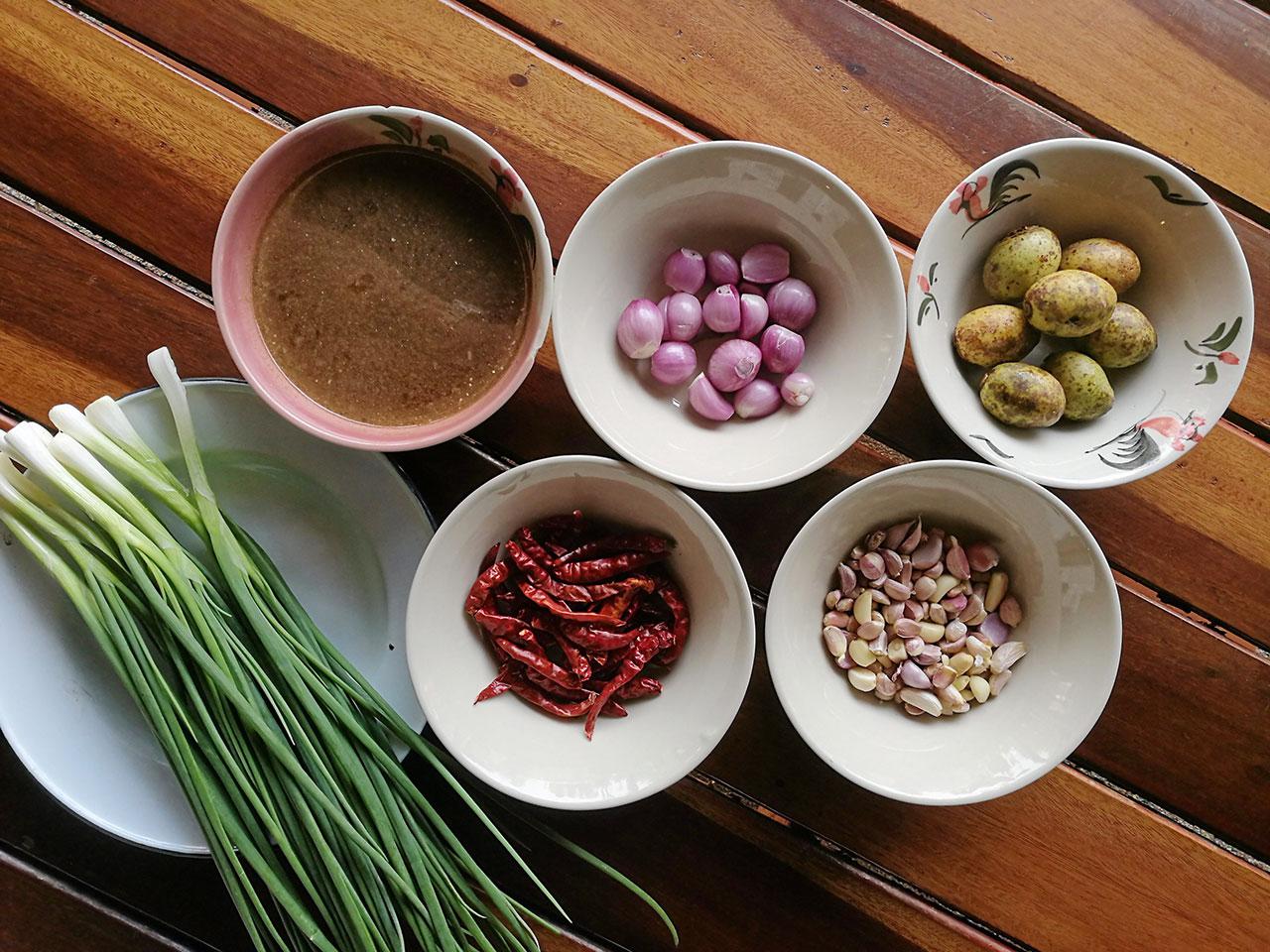 เครื่องปรุง : หัวหอมแดงไทย 4–5 หัว/กระเทียมไทย 15–20 กลีบ/พริกขี้หนูแห้ง 20 เม็ด/ต้นหอมหั่นเป็นท่อน 10 ต้น/มะกอกไทยห่ามๆ 3–4 ลูก/ปลาร้าต้มสุกกรองเอาแต่น้ำ 4–5 ช้อนโต๊ะ ......วิธีทำ 1) ปอกเปลือกหัวหอมแดงและกระเทียมนำไปคั่วในกระทะ ด้วยไฟกลางอ่อน จนกระทั่งสุกเกือบทั่ว และกลิ่นหอมฉุน ตักขึ้นพักไว้ 2) คั่วพริกขี้หนูแห้งในกระทะด้วยไฟอ่อน พอกลิ่นหอมฉุย ตักขึ้นพักไว้ 3) นำต้นหอมที่หั่นเป็นท่อนๆ ใส่กระทะใช้ไฟอ่อน พลิกกลับไปมาให้ต้นหอมนาบกระทะจนทั่ว ตักขึ้นพักไว้ 4) โขลกหัวหอมคั่ว กระเทียมคั่ว และพริกขี้หนูคั่วให้แหลกเข้ากันดี ฝานมะกอกทั้งเปลือกลงในครก โดยใส่เม็ดลงไปด้วย โขลกอย่างเบามือ อย่าให้เม็ดมะกอกแตก คลุกเคล้าให้เข้ากันดี 5) ปรุงรสด้วยน้ำปลาร้า เคล้าให้เข้ากัน ชิมให้ได้รส เค็มนำจากน้ำปลาร้า เปรี้ยวจากมะกอกนิดหน่อย และตัดหวานนิดๆ จากหัวหอมแดง 6) ใส่ต้นหอมนาบไฟลงไป คลุกเคล้าให้เข้ากัน หากรสใดยังอ่อนให้เติมรสนั้นได้ตามชอบ ทานคู่กับผักสดต่างๆ.