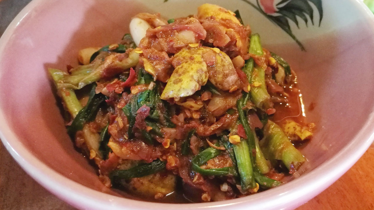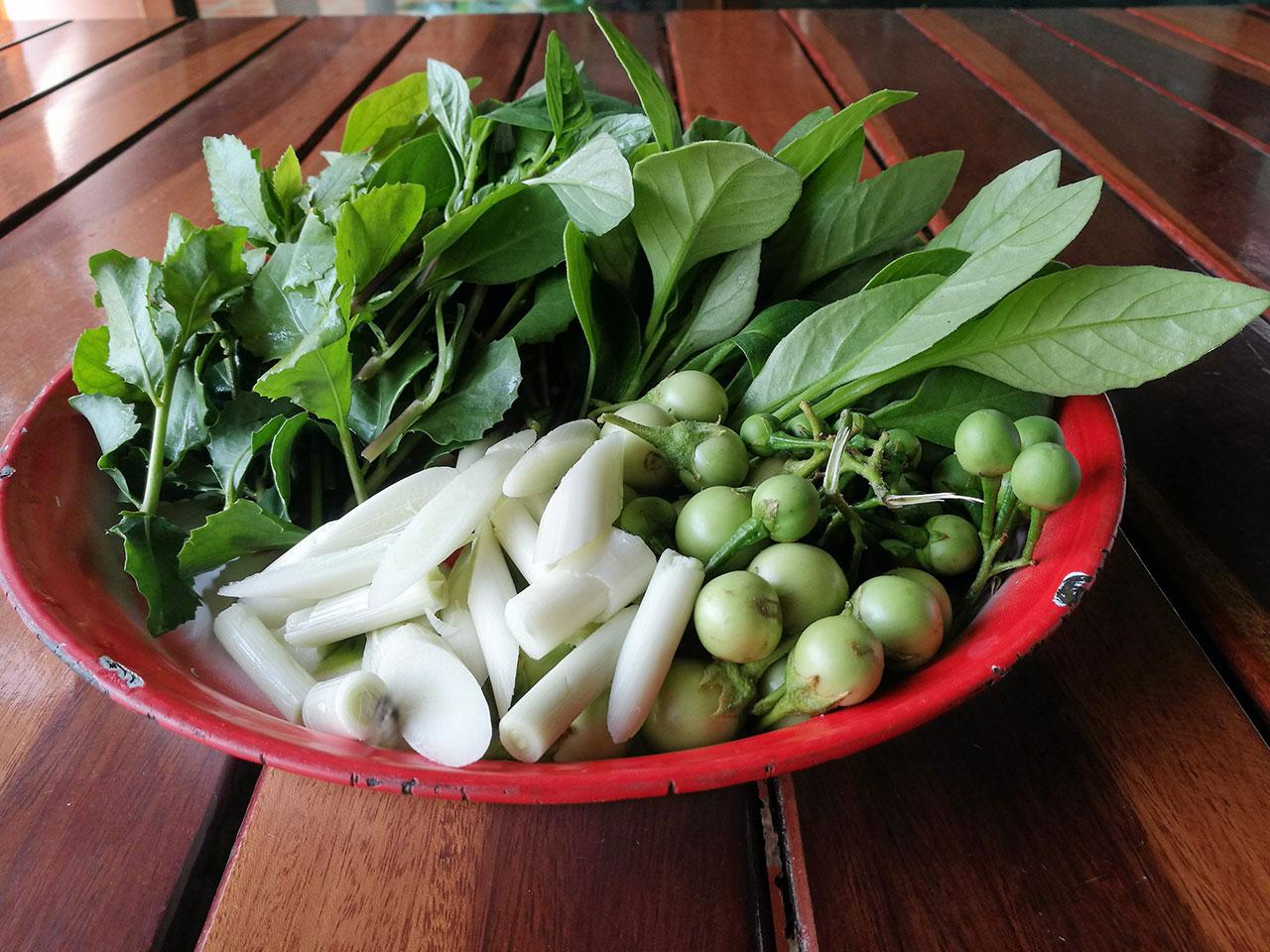 พืชผักอีสานที่คุณผึ้งปลูกไว้ในบ้านมีมากมายหลายชนิด อาทิ แป๊ะตำปึง สันพร้าหอม ผักเบี้ย เพกา ใบย่านาง มะกอกไทย ผักกาดขาวปลี ผักชีลาว ชะพลู และหน่อไม้ ซึ่งสามารถใช้กินได้กับ “น้ำพริกมะกอกไทย” ที่นำเสนอในวันนี้ โดยเธอเก็บมะกอกจากสวนในบ้าน มาโขลกน้ำพริกให้ได้ชิมกันอีกด้วย