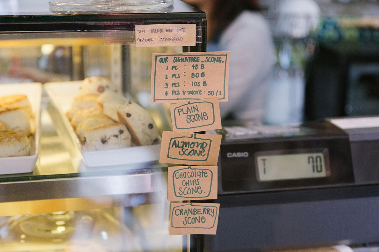 นอกเหนือจากฝีมือการประกอบจักรยานของคุณแทน หนุ่มเจ้าของร้าน ผู้ซึ่งลงมือปัด ปรับ แต่ง และชุบชีวิตจักรยานเก่าด้วยมือของตนเองอยู่เสมอแล้ว เหล่าบรรดาเบเกอรี่ภายในร้านก็ถูกปรุงและปรับแต่งด้วยกรรมวิธี Homemade เช่นเดียวกันจากคุณออย สาวที่เป็นทั้งคู่ชีวิตและผู้ร่วมสร้าง BAKING BIKE CAFÉ ให้กลายเป็นร้านในฝันที่สมบูรณ์แบบของทั้งสองคน ซึ่งวัตถุดิบทั้งหมดภายในร้านได้รับการคัดสรรเป็นอย่างดีจากทั้งคู่ เพราะฉะนั้นเราสามารถมั่นใจได้ว่าทั้งจักรยานและอาหารถูกส่งตรงจากใจถึงมือทุกคนอย่างแน่นอน