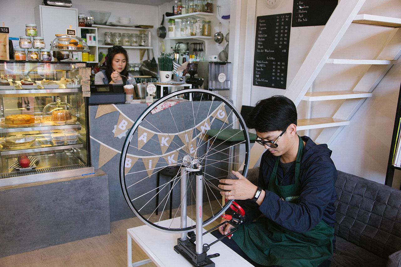 ใครจะคิดว่าทั้งสองสิ่งนี้จะสามารถอยู่รวมกันได้อย่างลงตัว เพราะมันช่างแปลกและน่าประหลาดใจไปพร้อมกัน BAKING BIKE CAFÉ ไม่ได้เป็นเพียงแค่ร้านคาเฟ่โชว์รถจักรยานเพื่อความสวยงามอย่างเดียวเท่านั้น ภายในร้านยังเป็นเหมือนกับคอมมูนิตี้ที่รวมคนรักจักรยานวินเทจ ทั้งคู่บอกกับเราว่า จุดเริ่มต้นมาจากความหลงใหลในจักรยานวินเทจของ ‘แทน-ธนารัตน์ พัฒนศิริ’ พิธีกรหนุ่มจากรายการ Do The Ride Thing ผู้ซึ่งสามารถเปลี่ยนความชื่นชอบของตัวเองให้กลายมาเป็นส่วนหนึ่งในชีวิตประจำวันได้ จากการเปิดร้านเพื่อรับเซอร์วิสจักรยาน ดูแลตั้งแต่รายละเอียดเล็กๆ น้อยๆ ไปจนถึงประกอบและปัดฝุ่นจักรยานวินเทจที่เคยมีอยู่ ให้กลับมามีชีวิตใหม่เหมือนเดิมอีกครั้ง