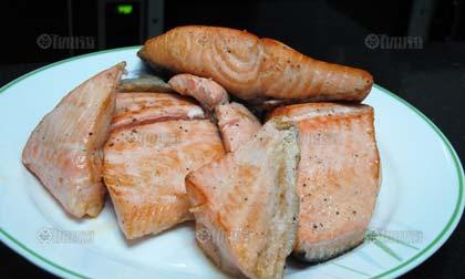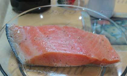 เครื่องปรุง : เนื้อปลาแซลมอน/เกลือ/พริก ไทย...วิธีทำ หมักเนื้อปลาแซลมอนกับเกลือและพริกไทย ประมาณ 10-15 นาที จากนั้นนำไปย่าง (Grilled) หรือทอดด้วยน้ำมันมะกอกเพียงเล็กน้อย เมื่อน้ำมันร้อนจึงนำปลาลงทอดจนสุก โดยใช้ไฟปานกลาง เมื่อเนื้อปลาสุกให้ตักขึ้นจากกระทะและซับน้ำมันออก