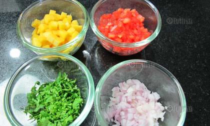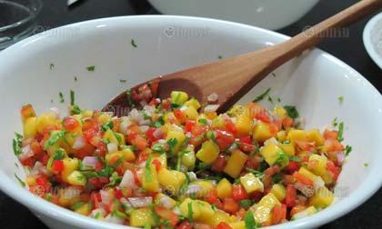 เครื่องปรุงซอสยำมะม่วง (Mango Salsa Salad) : น้ำมันมะกอก 10 มล./มะนาว (ตามชอบ)/เกลือ-พริกไทย/น้ำตาล/ผักชีสับ/มะม่วงน้ำดอกไม้ หั่นเต๋าเล็กๆ 1 ลูก/มะเขือเทศ ปอกเปลือกและเอาเม็ดออก หั่นเต๋าเล็กๆ 3 ลูก/หอมแดงหั่นเต๋าเล็กๆ 50 กรัม/ พริกขี้หนู 1-2 เม็ด หรือตามชอบ...วิธีทำ ผสมมะม่วง มะเขือเทศ หอมแดง และพริกขี้หนูเข้าด้วยกัน จากนั้นผสมน้ำมะนาว น้ำตาล เกลือ พริกไทยเข้าด้วยกัน แล้วค่อยๆเทน้ำมันมะกอกลงผสม และตีจนเข้ากันดี จึงนำส่วนผสมที่เตรียมไว้ทั้งหมดผสมเข้าด้วยกัน และโรยผักชีคลุกเคล้าให้เข้ากัน