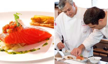ตามมาด้วยเมนูจานที่สอง คือ ปลาเทราต์ทะเลนึ่งชูวีส อิคูราซัลซ่า อองไดว์ ทาตั้ง และสมุนไพรวินีเกรต รสขิง ฝีมือปรุงของ "เชฟมิเชล เบอร์ลิเย่" จากโรงแรมเซ็นทาราแกรนด์ฯ เซ็นทรัลเวิลด์ จับคู่กับ "เชฟนิโคลา ชเนลเลอร์" จากโรงแรมโฟร์ซีซั่นส์