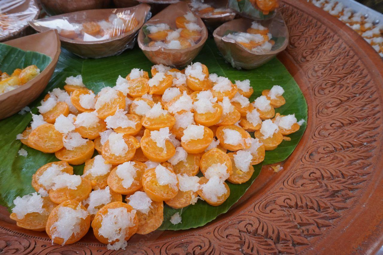 เดินมาช่วงกลางๆ ของโซนอาหารหาทานยาก เราก็เจอเข้ากับเมนู ‘หันตรา’ เป็นขนมหวานโบราณที่หาทานได้เฉพาะเกาะเกร็ด หน้าตาเหมือนขนมไทยจำพวกเม็ดขนุน ทำจากถั่วบดปั้นเป็นก้อนแล้วชุบไข่แดง ต้มในน้ำเชื่อมเดือดจนสุก โรยหน้าด้วยไข่ขาวยีหวานๆ เราจัดมาลองชิมดูปรากฏว่าหอมอร่อยใช้ได้เลย ไม่หวานจนเกินไป รสชาติก็คล้ายๆ กับเม็ดขนุน แต่หน้าตาดีและอร่อยกว่า (ความเห็นส่วนตัว ใครอยากพิสูจน์ต้องไปลองชิมเอง)