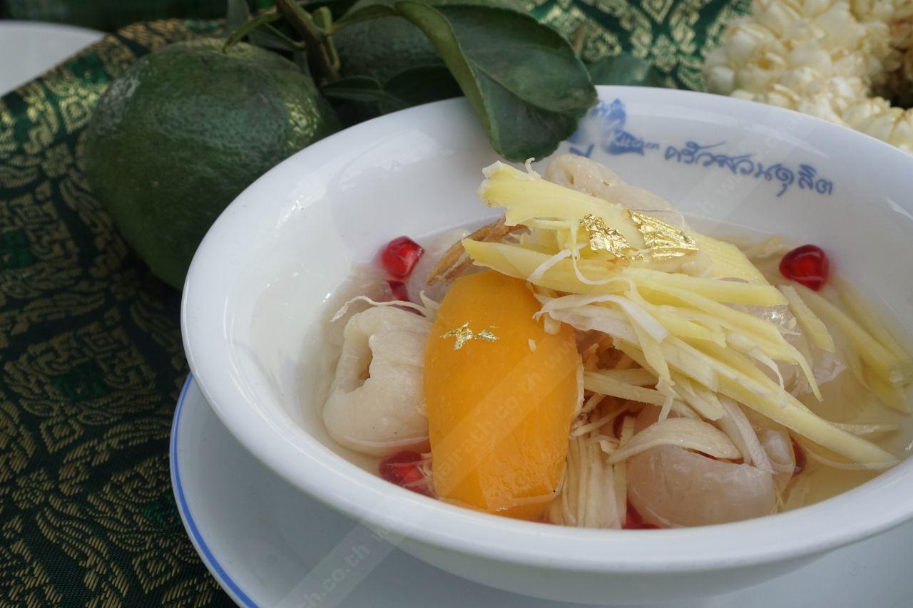 เราค้นพบเมนูนี้ที่ร้านครัวสวนดุสิต ส่งกลิ่นหอมเย็นๆ ทันทีที่เดินผ่าน พอดมๆ ดูแล้วอยากรู้อะ เลยพุ่งเข้าไปถามว่าเจ้าสิ่งนี้คืออะไร? ได้ความว่า จานนี้เป็นผลไม้ลอยแก้วที่มีความพิเศษต่างจากผลไม้ลอยแก้วอื่นๆ ตรงที่ ‘น้ำลอยแก้ว’ โดยจะใส่ส่วนผสมของน้ำส้มซ่าที่ให้กลิ่นหอมไม่เหมือนใคร และให้รสเปรี้ยวแบบกลมกล่อม ไม่เปรี้ยวแหลม