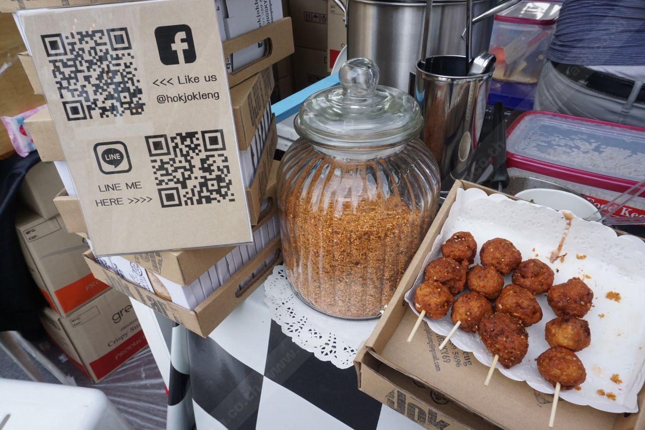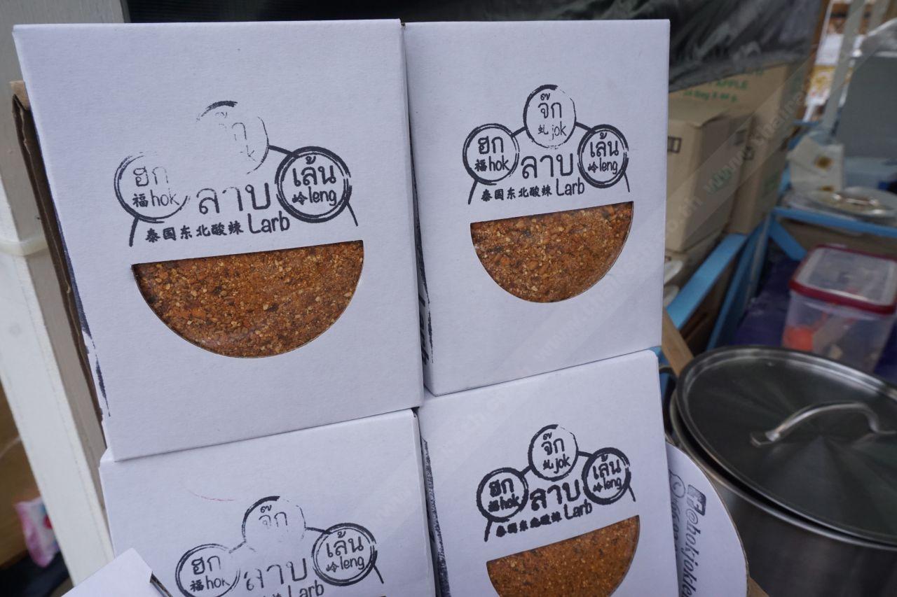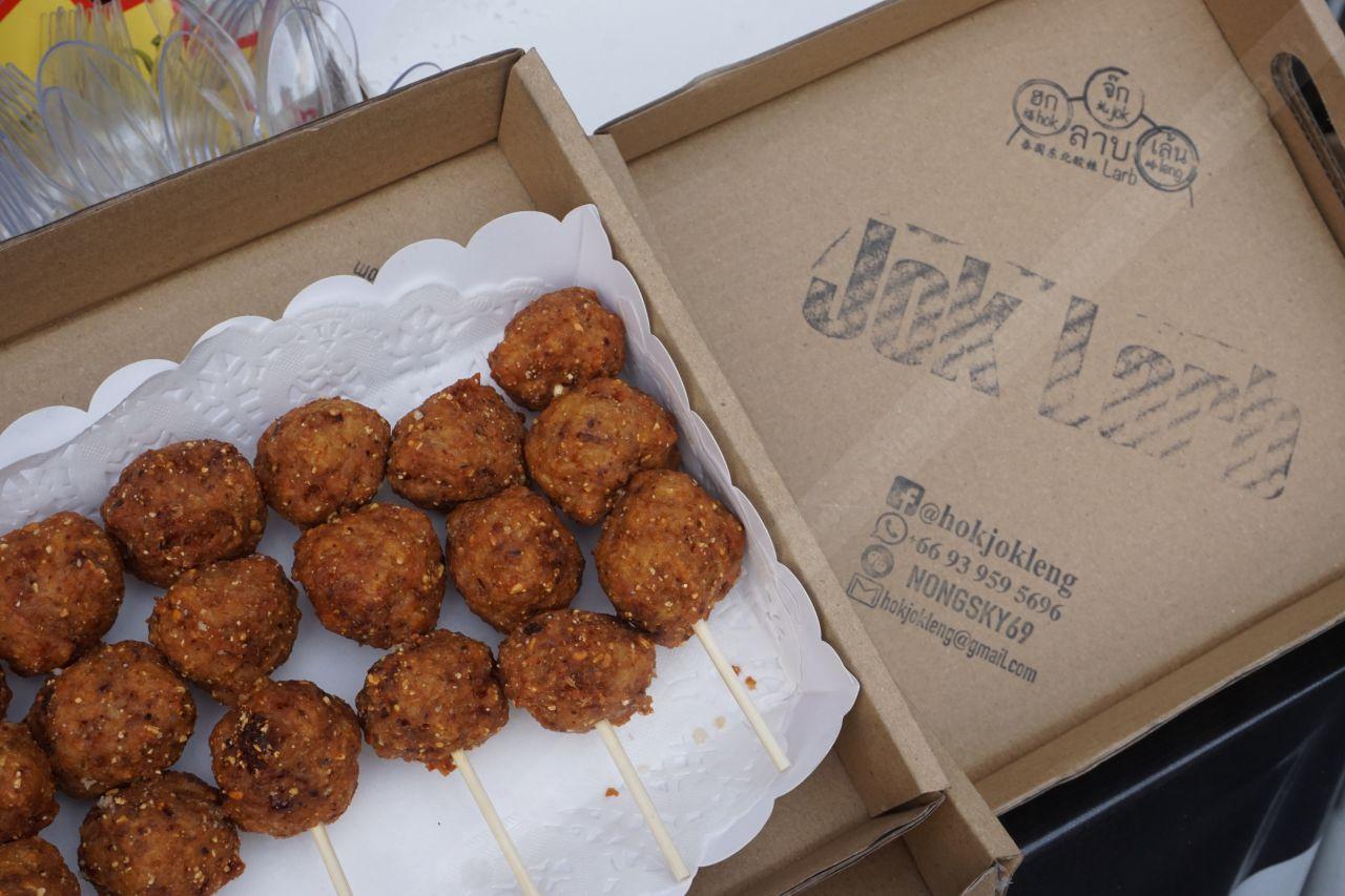 มาถึงร้านนี้ก็ด้วยความบังเอิญ เห็นโหลแก้วใส่ผงอะไรไม่รู้แห้ง ข้างๆ เป็นมีทบอลลูกใหญ่เสียบไม้ เดินเข้าไปถามได้ความว่าเขาเป็นร้านจำหน่ายผงปรุงลาบแบบแห้ง สำหรับส่งออกต่างประเทศ เริดไปอีก... อ้อ! อีกอย่างเราชอบชื่อแบรนด์ด้วย เขาใช้ชื่อว่า ฮก จ๊ก เล้น (hok jok leng) เท่ดีอะ แปลกแตกต่าง ติดหูได้ไม่ยาก ส่วนเจ้ามีทบอลที่เสียบไม้อยู่ ก็คือ 'เมนูลาบทอด' ที่เอามาเดเคอเรตหน้าตาใหม่ ให้เหมือนลูกชิ้นเสียบไม้ ดูดี แถมอร่อยด้วยนะ