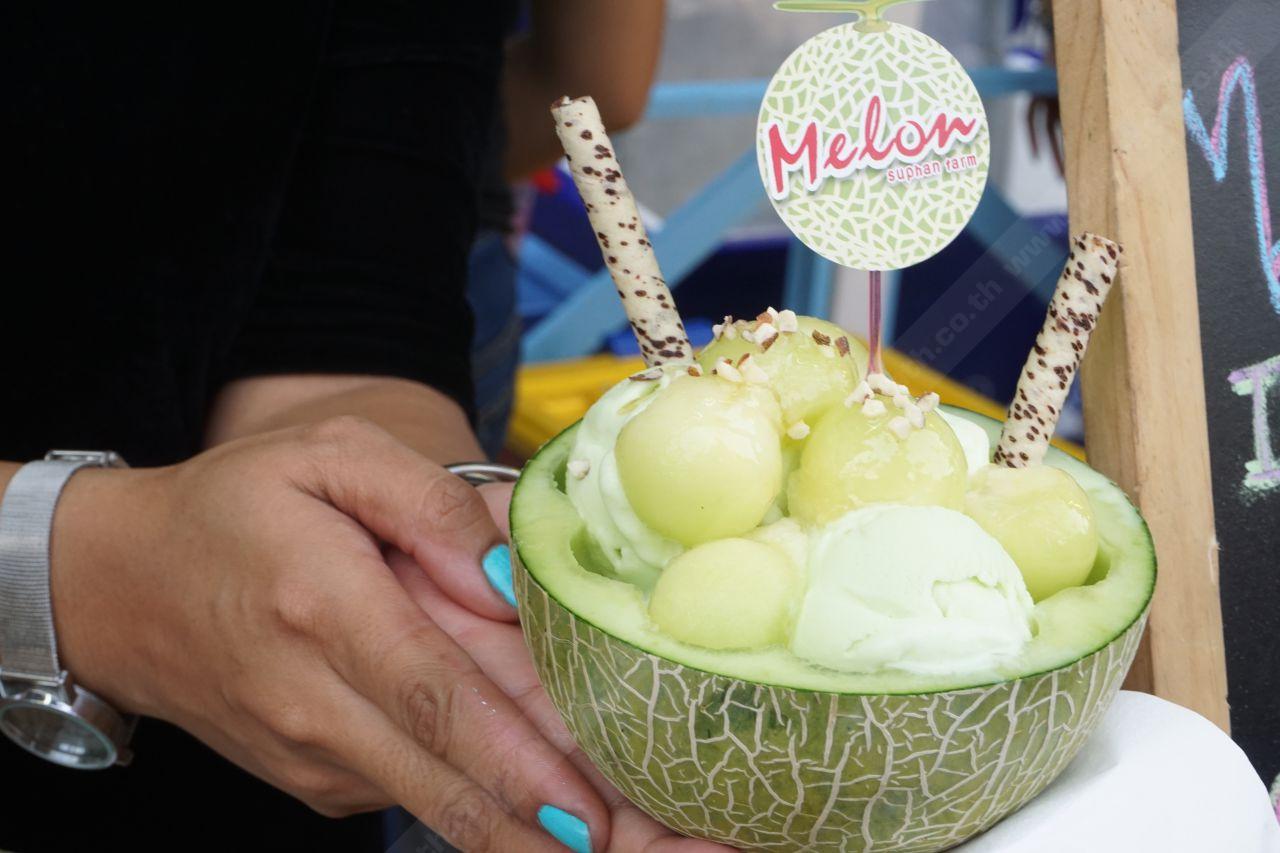 ปิดท้ายกันที่ของหวานซะหน่อยเนอะ ร้านนี้ชื่อว่า Melon Suphan Farm มองเผินๆ ก็ไม่ได้มีอะไรโดดเด่นแตกต่าง แต่พอเข้าไปดูเมนูใกล้ๆ เขามีความน่าสนใจซ่อนอยู่ โดยเฉพาะเมนูเมลอนปั่น มีให้เลือกถึง 3 แบบ มีตั้งแต่เมลอนปั่นรสธรรมชาติไม่ปรุงแต่งเพิ่มเลย เนื้อเมลอนล้วนเลยจ้ะ แล้วก็มีเมลอนปั่นครีมนมนุ่มๆ เมลอนปั่นมิกซ์เลมอนหวานๆ เปรี้ยวๆ แถมด้วยเมนูเด็ดคือ Melon Ice Cream Honey แบบเซตแค่ 89 บาท จัดไปให้เต็มคราบ