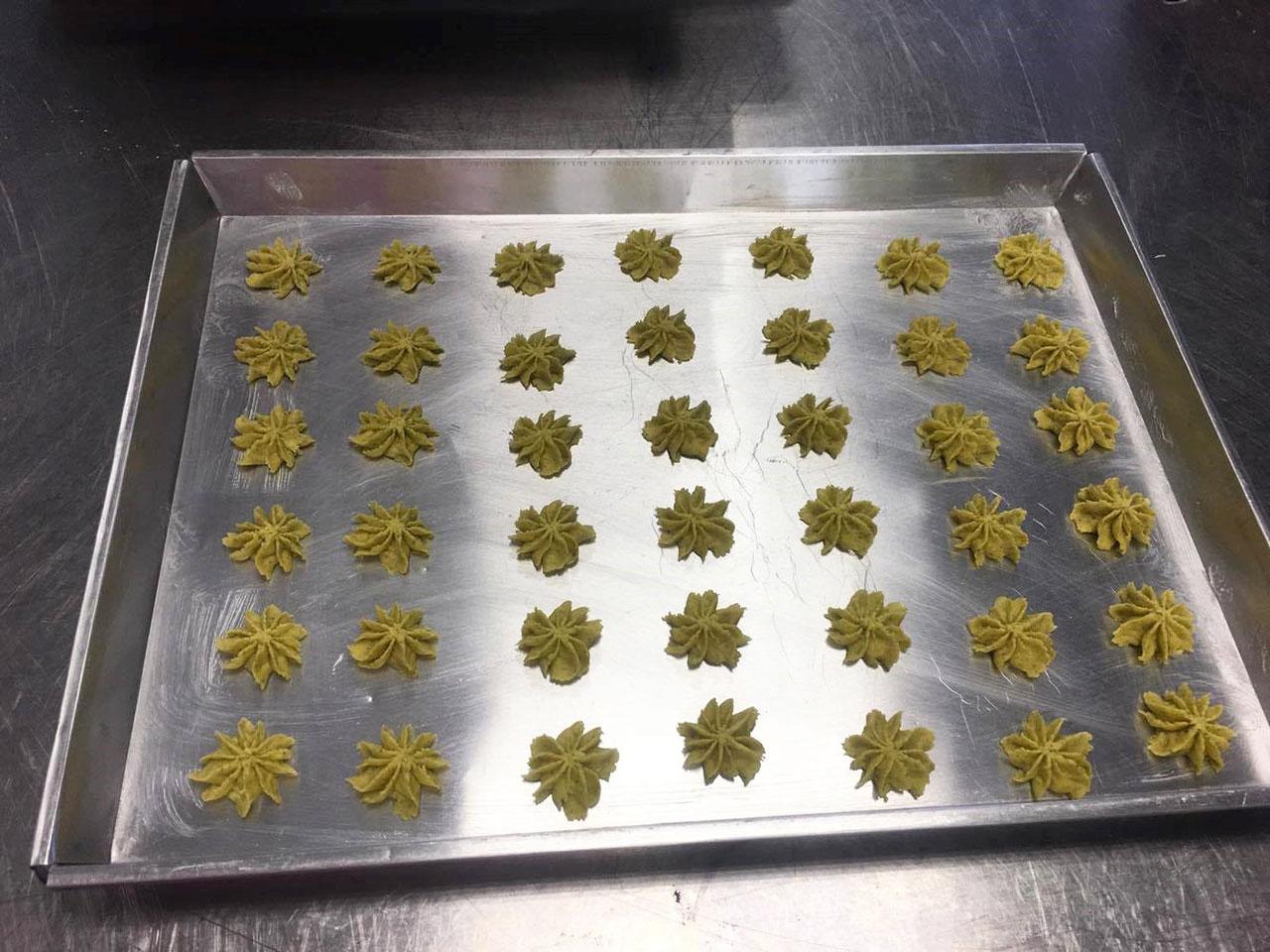 7. นำส่วนผสมคุกกี้ที่ได้ใส่ลงในถุงบีบคุกกี้ นำถาดอบคุกกี้มาทาเนยขาวบางๆ บนถาดให้ทั่ว บีบส่วนผสมคุกกี้ที่ได้ลงไปบนถาดให้เป็นรูปดอกไม้ เส้นผ่าศูนย์กลางประมาณ 1 นิ้ว