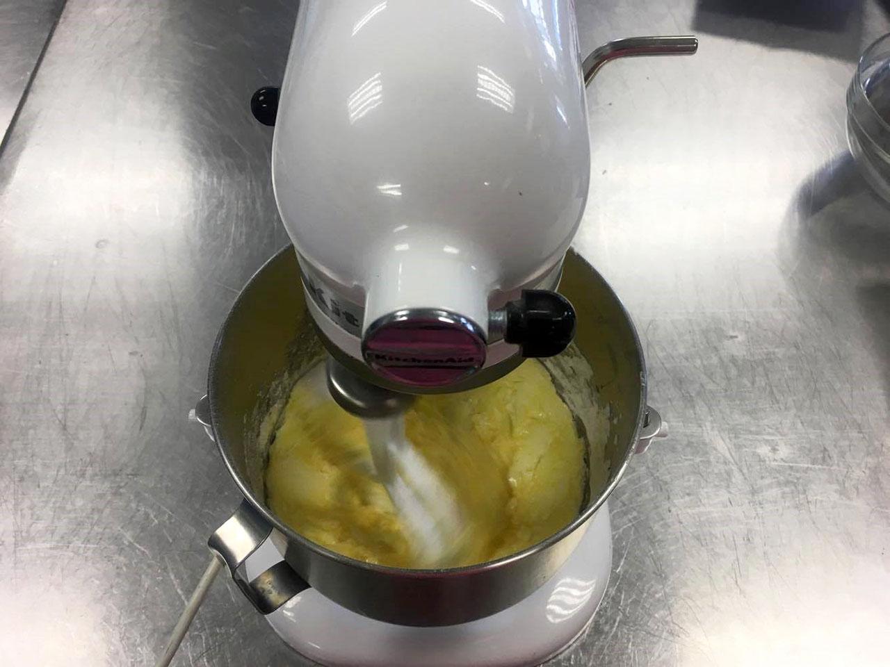 4. นำเนยสดใส่ในเครื่องผสม ตีเนยสดด้วยความเร็วปานกลางจนอ่อนตัว จากนั้นค่อยๆ เติมน้ำตาลทรายป่นจนหมด แล้วตีด้วยความเร็วสูงให้ส่วนผสมเข้ากัน จนส่วนผสมฟูเบา