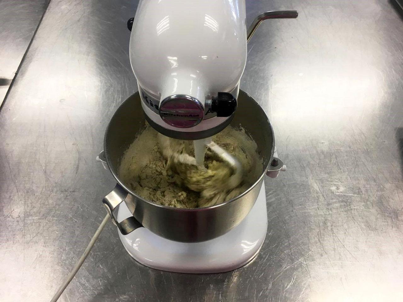 6. จากนั้นลดความเร็วอ่อนสุด แล้วค่อยใส่แป้งที่พักไว้จนหมด ตีให้ส่วนผสมเข้ากัน