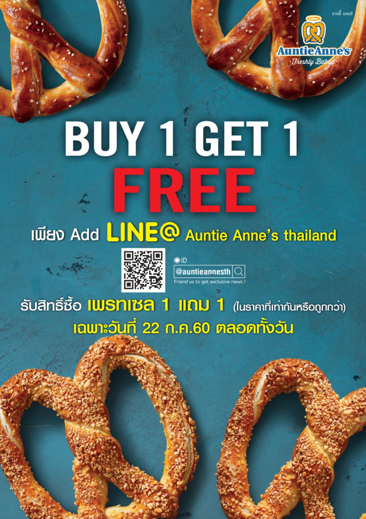 วันเสาร์ที่ 22 ก.ค. 2560 ฉลองวันฟรี เพรทเซลเดย์ 2017 ต่อเนื่องเป็นเป็นปีที่ 18 แจกเพรทเซล ฟรี 2 รสชาติสุดฮิต อัลมอนด์ เพรทเซล และ ออริจินัล เพรทเซล มอบโปรโมชั่นพิเศษ ซื้อ เพรทเซล 1 ชิ้น รับฟรีอีก 1 ชิ้น (ในราคาที่เท่ากันหรือถูกกว่า) ตลอดทั้งวัน เพียงแอด Line @auntieannesth โทร. 0-2663-3888