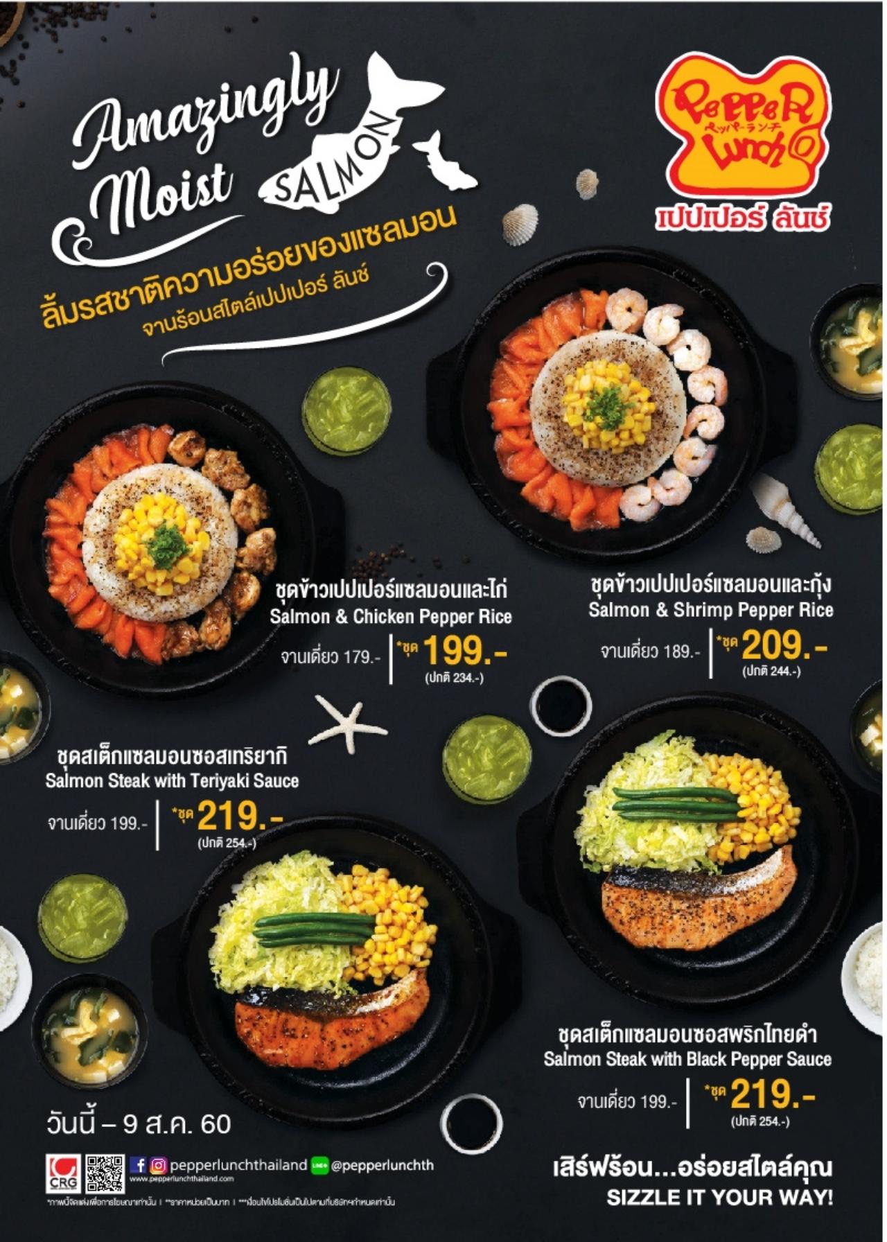 วันนี้ เปปเปอร์ ลันช์ เสิร์ฟ 4 เมนู ในราคาเริ่มต้นเพียง 199 บาท (ทุกชุดเสิร์ฟพร้อมเครื่องดื่ม และซุปมิโซะ) ชุดข้าวแซลมอนและไก่ ชุดข้าวเปปเปอร์แซลมอนและกุ้ง ชุดสเต๊กแซลมอนซอสพริกไทยดำ