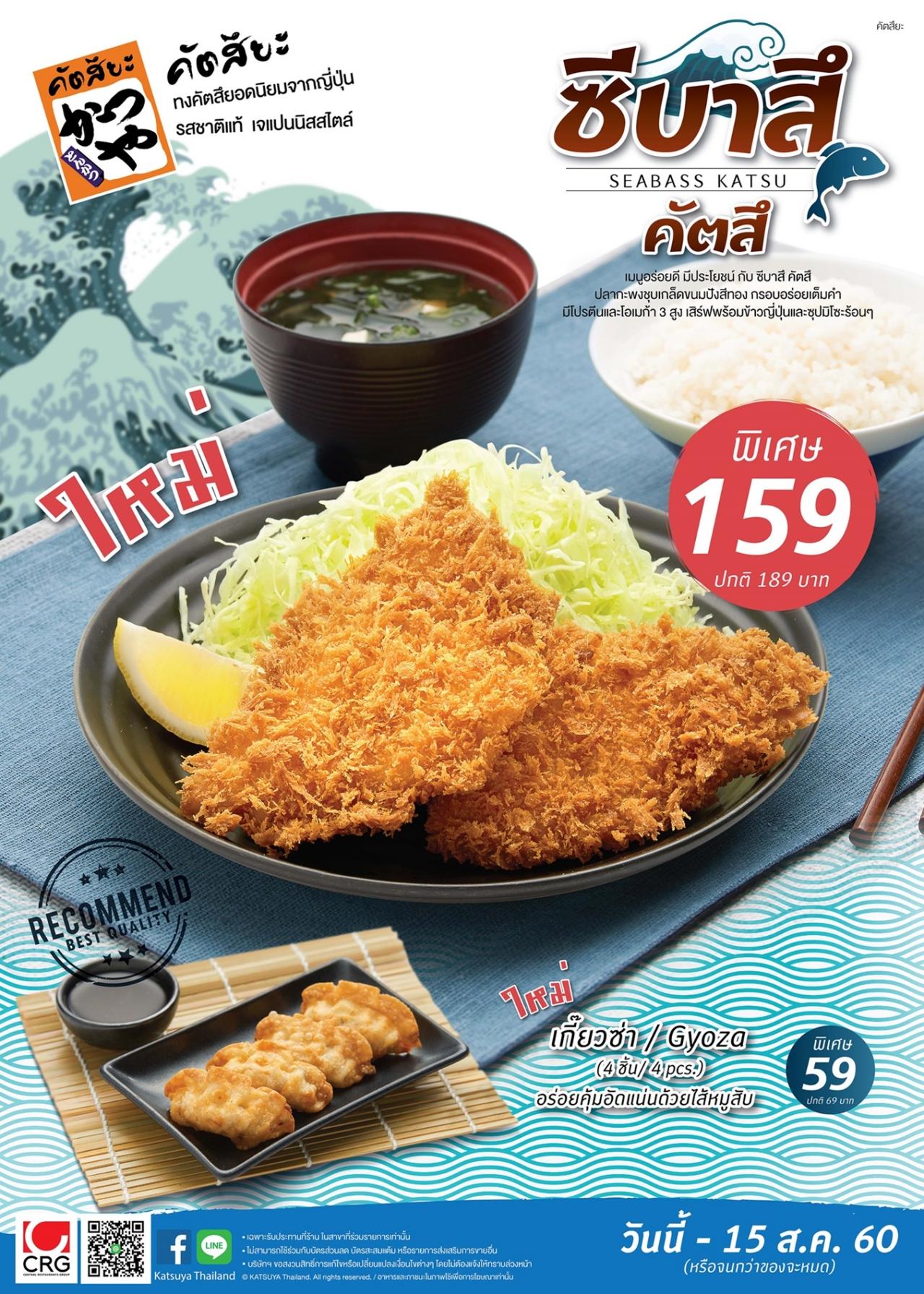 วันนี้ – 15 ส.ค. 2560 คัตสึยะชวนลิ้มลองเมนูใหม่ อร่อยดี มีประโยชน์ กับ ซีบาสึ คัตสึ เมนูปลากะพงชิ้นใหญ่ มีโปรตีน และโอเมก้า 3 สูง นำมาชุบเกล็ดขนมปังสีทอง กรอบอร่อยเต็มคำ 2 ชิ้นให้เต็มอิ่ม เสิร์ฟพร้อมข้าวญี่ปุ่น และซุปมิโซะร้อนๆ พิเศษ 159 บาท (ปกติ 189 บาท) หรือสั่งเป็นชุด