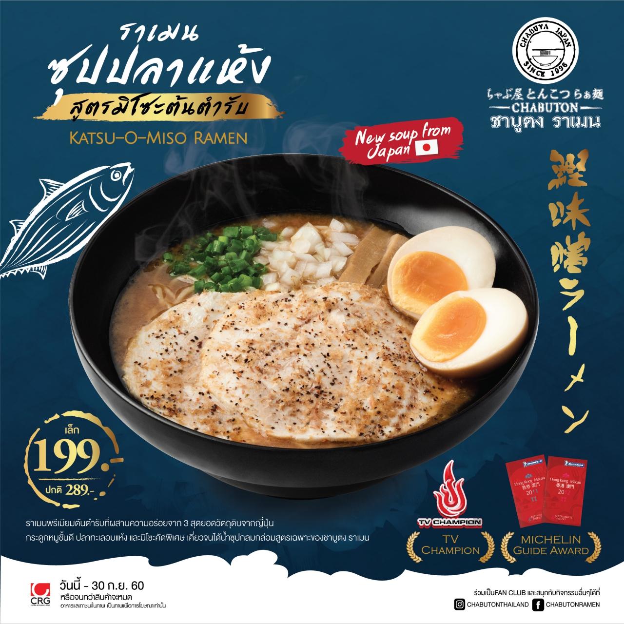 วันนี้ – 30 ก.ย. 2560 ชวนมากินราเมนต้นตำรับจากประเทศญี่ปุ่น ผสานความอร่อยจาก 3 สุดยอดวัตถุดิบจากญี่ปุ่นที่ กระดูกหมูชั้นดี, ปลาทะเลอบแห้ง และมิโซะคัดพิเศษ นำมาเคี่ยวจนได้น้ำซุปหอมๆ รสชาติกลมกล่อม สูตรเฉพาะของชาบูตง ราเมน เสิร์ฟพร้อมทอปปิ้งเต็มๆ ทั้งหมูชาชูสูตรดั้งเดิม และไข่ต้มยางมะตูมหมักซอส