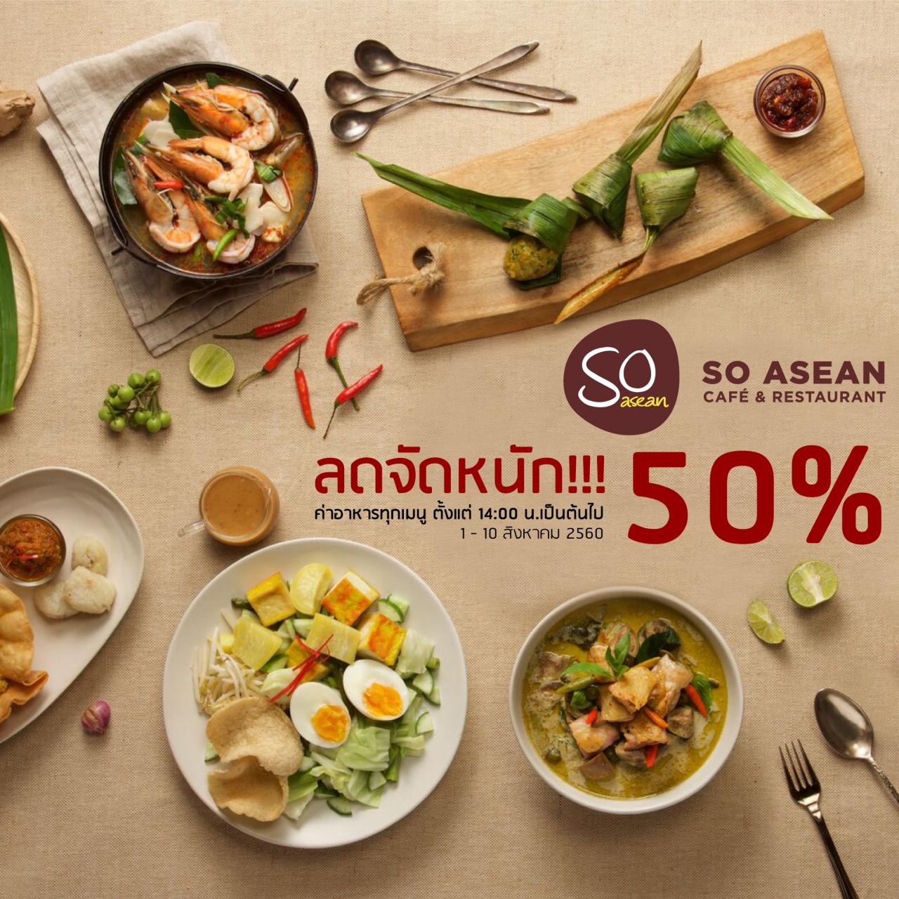 ฟู้ดเลิฟเวอร์ที่ชื่นชอบอาหารไทย-อาเซียน รสจัดจ้าน เข้มข้น เตรียมอร่อยพุงกาง เมื่อร้านอาหาร “SO asean” ลดจัดหนัก! มอบส่วนลดสุดพิเศษ HAPPY HOUR ทุกวัน ตั้งแต่วันนี้ ถึง 10 สิงหาคม 2560 นี้ โดยลด 50% (เฉพาะอาหาร ไม่รวมเครื่องดื่มและขนมหวาน) เมื่อใช้บริการที่ร้านตั้งแต่บ่าย 2 โมงเป็นต้นไป ที่ร้าน “SO asean” สาขา The Street, Gateway เอกมัย, อาคาร CW Tower, FYI center และ Empire Tower รีบชวนกันไปอร่อยเด็ด ลองแล้วจะติดใจแน่น่อน!