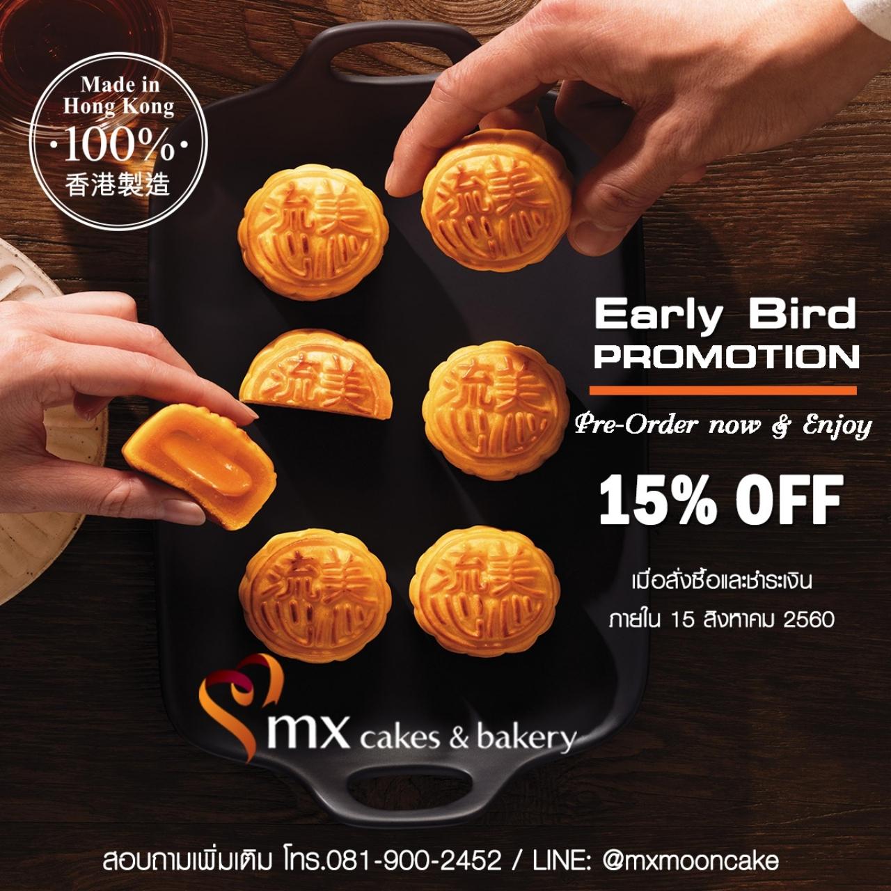 วันนี้-15 ส.ค. 2560 ขนมไหว้พระจันทร์สูตรต้นตำรับฮ่องกง มาลองชิมเลยที่ร้าน MX Cakes & Bakery ส่งตรงสุดยอดขนมไหว้พระจันทร์แบรนด์ “Hong Kong MX Mooncake” ที่ขายดีอันดับ 1 ในฮ่องกงถึง 19 ปีซ้อน การันตีรางวัลจากสถาบันระดับโลก Monde Selection พร้อมจัดโปรโมชั่นพิเศษช่วงนี้ “Early Bird Promotion” เพียงพรีออเดอร์ตั้งแต่วันนี้ ผ่านช่องทาง LINE ID: @mxmooncake รับไปเลยส่วนลด 15%