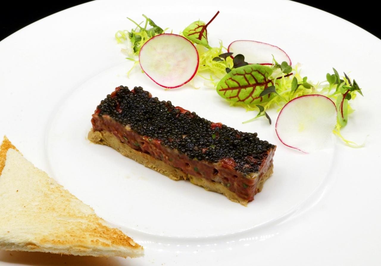 - สลัดเนื้อดิบชาโรเลส์ดรายเอจ กับตับห่าน และไข่ปลาคาร์เวีย เสิร์ฟพร้อมไข่ปลาคาร์เวีย