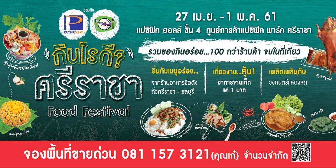 วันที่ 27 เมษายน - 1 พฤษภาคม 2561 ชวนมาอิ่มอร่อยในงาน "กินไรดี ศรีราชา Food Festival" ณ แปซิฟิค ฮอลล์ ชั้น 4 อ.ศรีราชา จ.ชลบุรี ภายในงานรวบรวมร้านอาหาร ของกินขึ้นชื่อในชลบุรีกว่า 100 ร้าน บนเนื้อที่กว่า 1,400 ตารางเมตร
