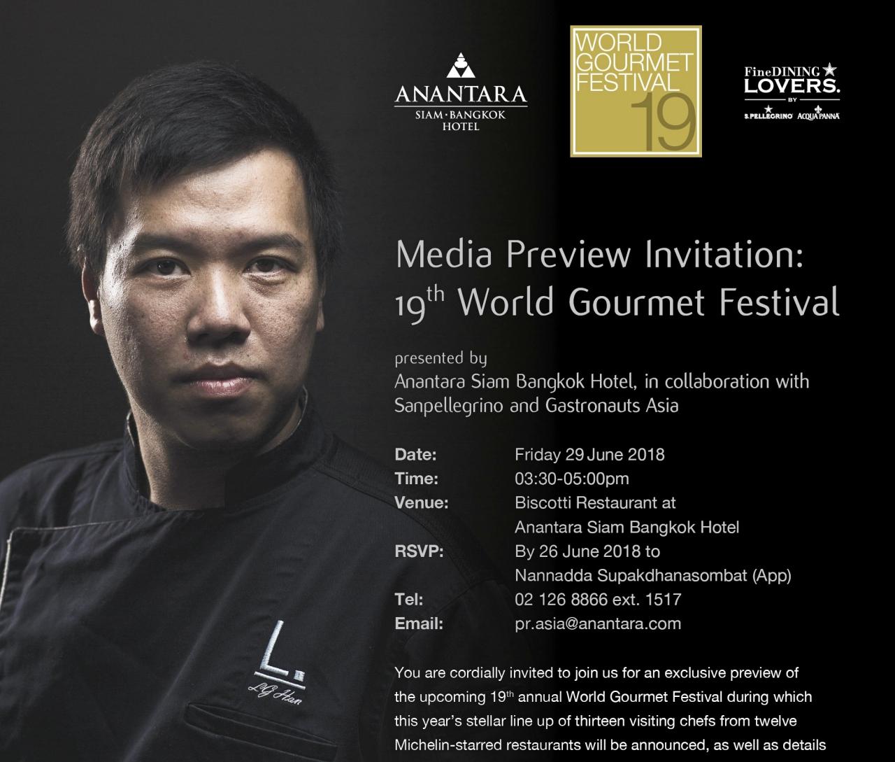 วันที่ 3-9 กันยายน 2561 ชวนคุณมาอิ่มอร่อยเหนือระดับในงาน เทศกาลอาหารและไวน์ระดับโลก ประจำปีครั้งที่ 19 ณ โรงแรมอนันตรา สยาม กรุงเทพ ซึ่งในปีนี้ โรงแรมฯ ร่วมกับ ซานเปลเลกรีโน (Sanpellegrino) และ แกสโทรนอทส์ เอเชีย(Gastronauts Asia)