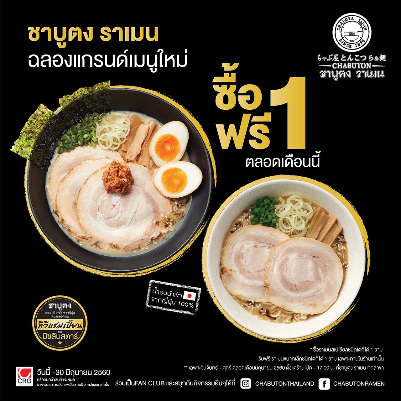 วันนี้ - 30 มิถุนายน 2560 ชวนมาอร่อยสไตล์ญี่ปุ่นกับ “ราเมนต้นตำรับจากประเทศญี่ปุ่น” โดยสุดยอดเชฟราเมน ทีวีแชมป์เปี้ยนรายแรก และรายเดียวในประเทศไทย ณ ร้านชาบูตงทุกสาขา ฉลองแกรนด์เมนูใหม่ ซื้อ 1 แถม 1 ฟรี เพียงซื้อราเมนสเปเชียลชนิดใดก็ได้ 1 ชาม รับฟรี ราเมนขนาดเล็กชนิดใดก็ได้ 1 ชาม เฉพาะทานในร้านเท่านั้น เฉพาะวันจันทร์ – ศุกร์ ตั้งแต่ร้านเปิด – 17.00 น. โดยมีเมนูราเมนสเปเชียล ได้แก่