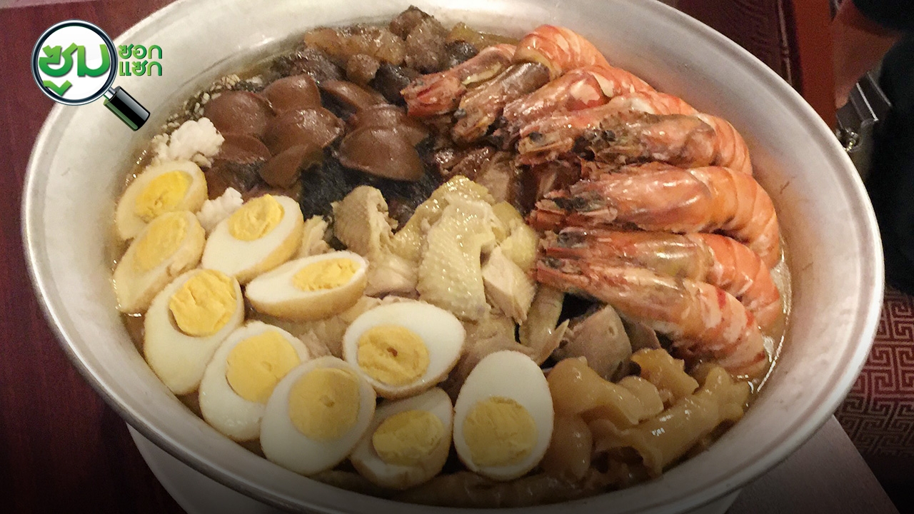 รวมแล้วน่าจะกว่า 15 อย่างนึ่งและอบมาด้วยน้ำพะโล้ เพราะมีกลิ่นในทำนองนั้น ซึ่งจะเรียก “จับฉ่าย” คงไม่ได้เพราะไม่ใช่ผักอย่างเดียว และจำนวนประเภทของวัตถุดิบที่มาปรุงอาหารก็กว่า 10 อย่างเข้าไปแล้ว