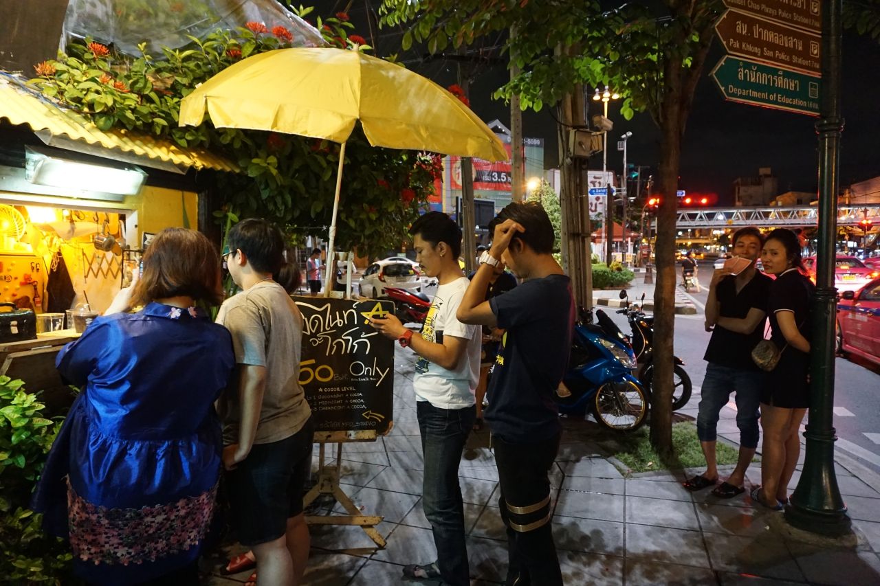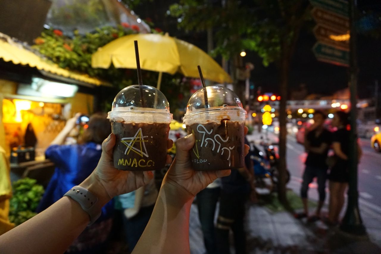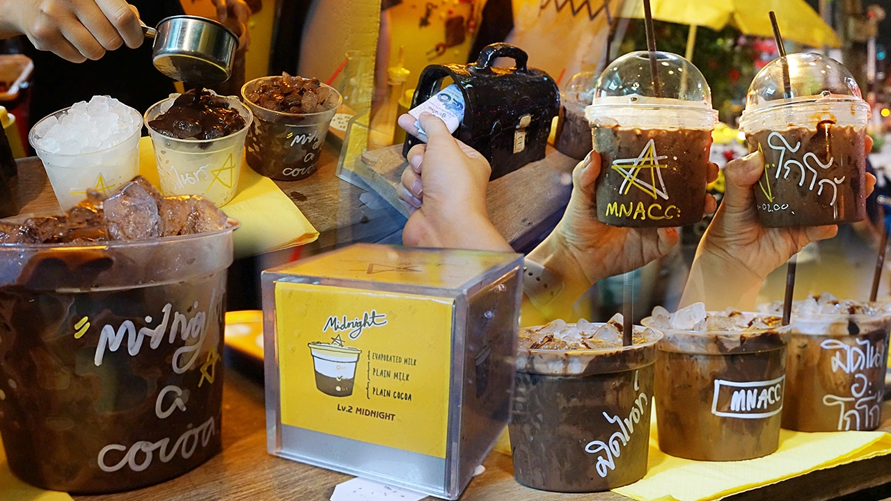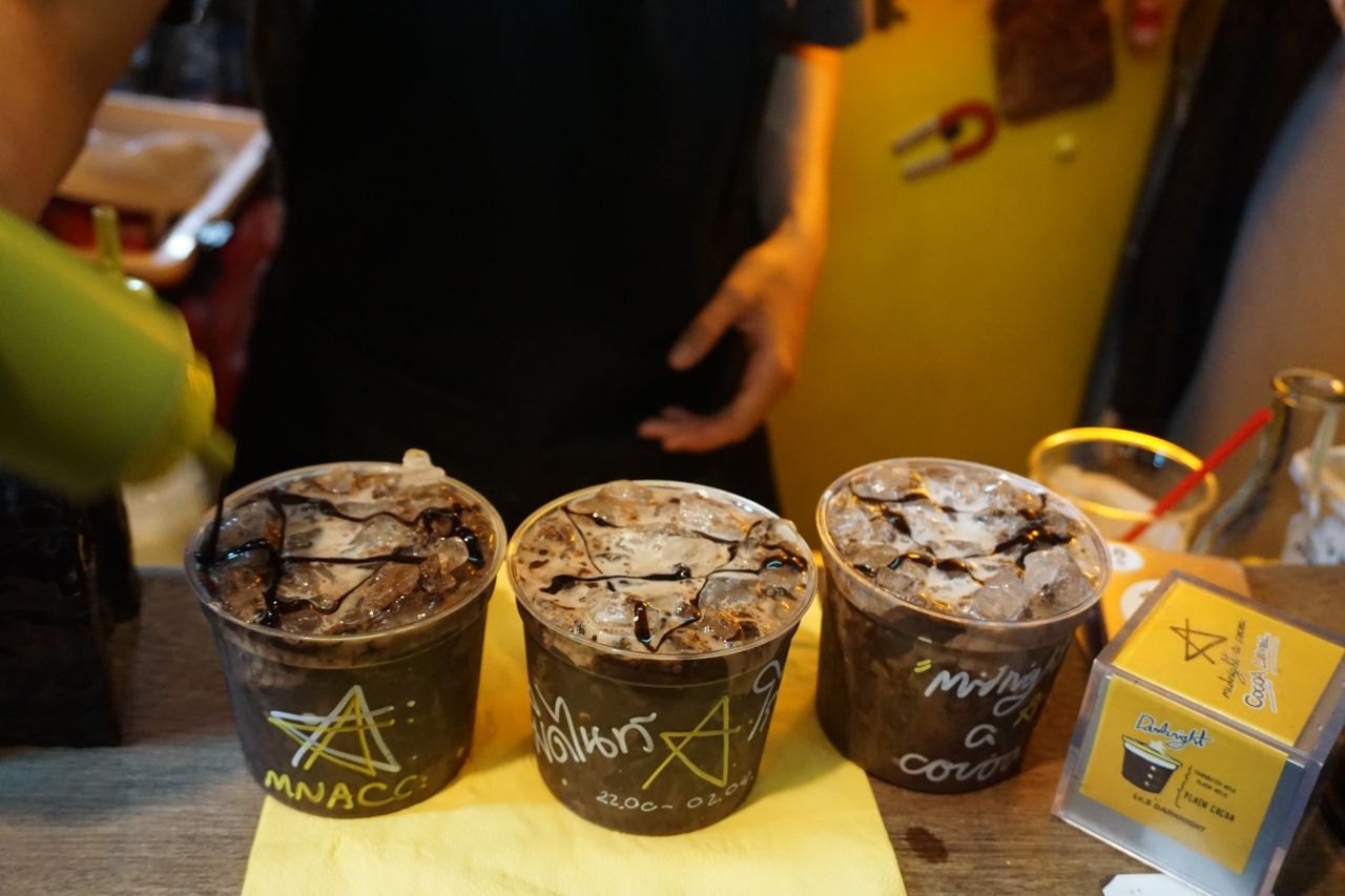 “บางทีลูกค้าเขาอาจจะชอบขมกว่านี้หรือหวานกว่านี้ เราก็จะมีขวดที่ชงแบบขม อีกขวดหนึ่งชงแบบหวานและมีเหยือกที่ชงโกโก้รสกลางๆ แยกกันไว้เลย เวลาขายเราก็จะเทโกโก้รสชาติกลางๆ ตามสไตล์เจ้าของร้านไปก่อน ตามธรรมเนียมร้านเราคือ จะให้ลูกค้าชิมก่อน ถ้าอยากได้ขมกว่านี้ เราก็จะเติมโกโก้ขมเพิ่มให้ หรือถ้าใครอยากได้หวานกว่านี้ก็มีแบบหวานเติมให้ ปรุงได้ตามใจคุณเช่นกัน ไม่ใช่ตามใจแม่ค้าอย่างเดียว เราคิดว่า ไหนๆ ยอมกินดึกแล้วอ้วนทั้งที ก็ขออ้วนในรสชาติที่ใช่ที่สุด ฟินที่สุด”