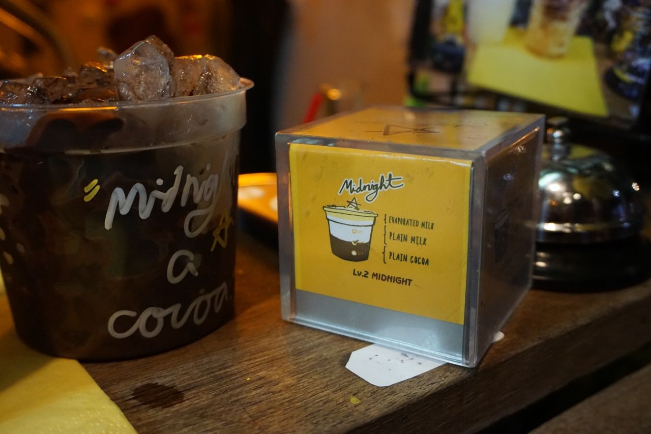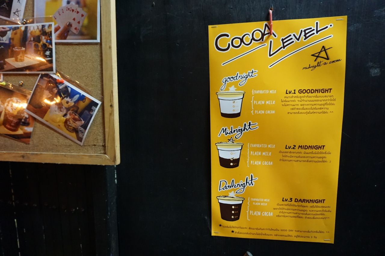 ลูกค้าที่ชอบดื่มโกโก้เหมือนเจ้าของร้าน ไม่ได้แปลว่าเขาจะชอบรสเดียวกัน จริงๆ โกโก้มีหลายระดับความเข้มข้น ดังนั้นที่ร้านนี้จึงมีเลเวลความเข้มข้นให้เลือก แบ่งเป็น Goodnight, Midnight, Darknight แตกต่างกันที่ปริมาณโกโก้และปริมาณนม เสิร์ฟมาในแก้วไซส์ขนาดกลางๆ พอดีกับการดื่มในมื้อดึกก่อนนอน