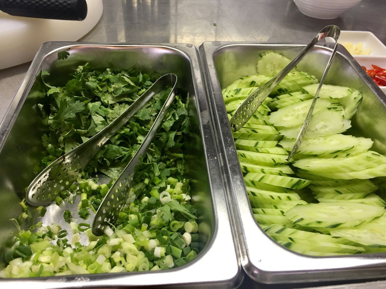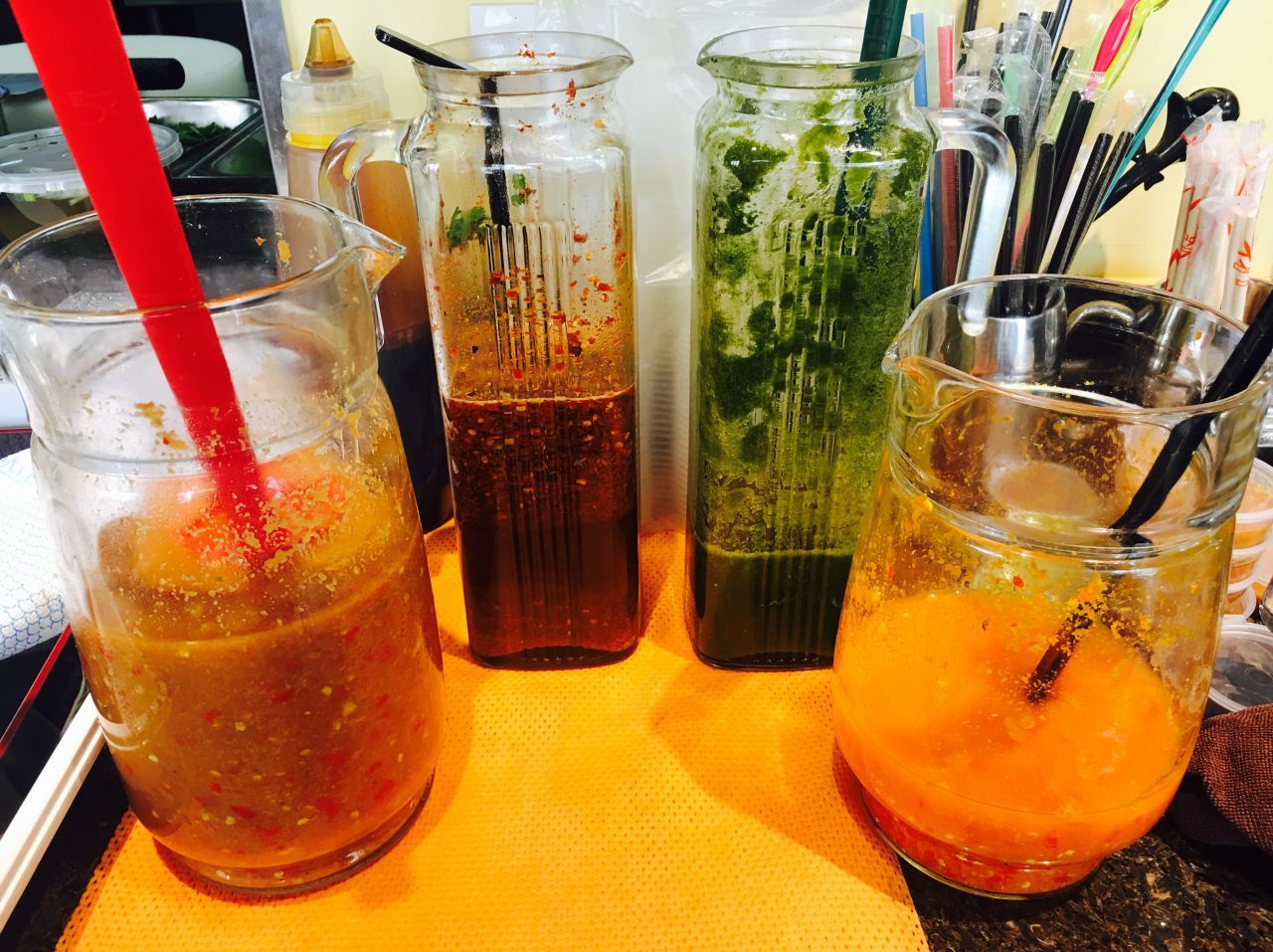 เรามีน้ำจิ้มอยู่หลายแบบ อย่างน้ำจิ้มซีฟู้ด น้ำจิ้มแจ่ว พริกน้ำส้ม เราก็ทำไว้หมด เพื่อให้ลูกค้าได้มีตัวเลือก และเราก็เลือกใช้วัตถุดิบที่ดี คือสั่งมาจากร้านคนไทยเหมือนกัน