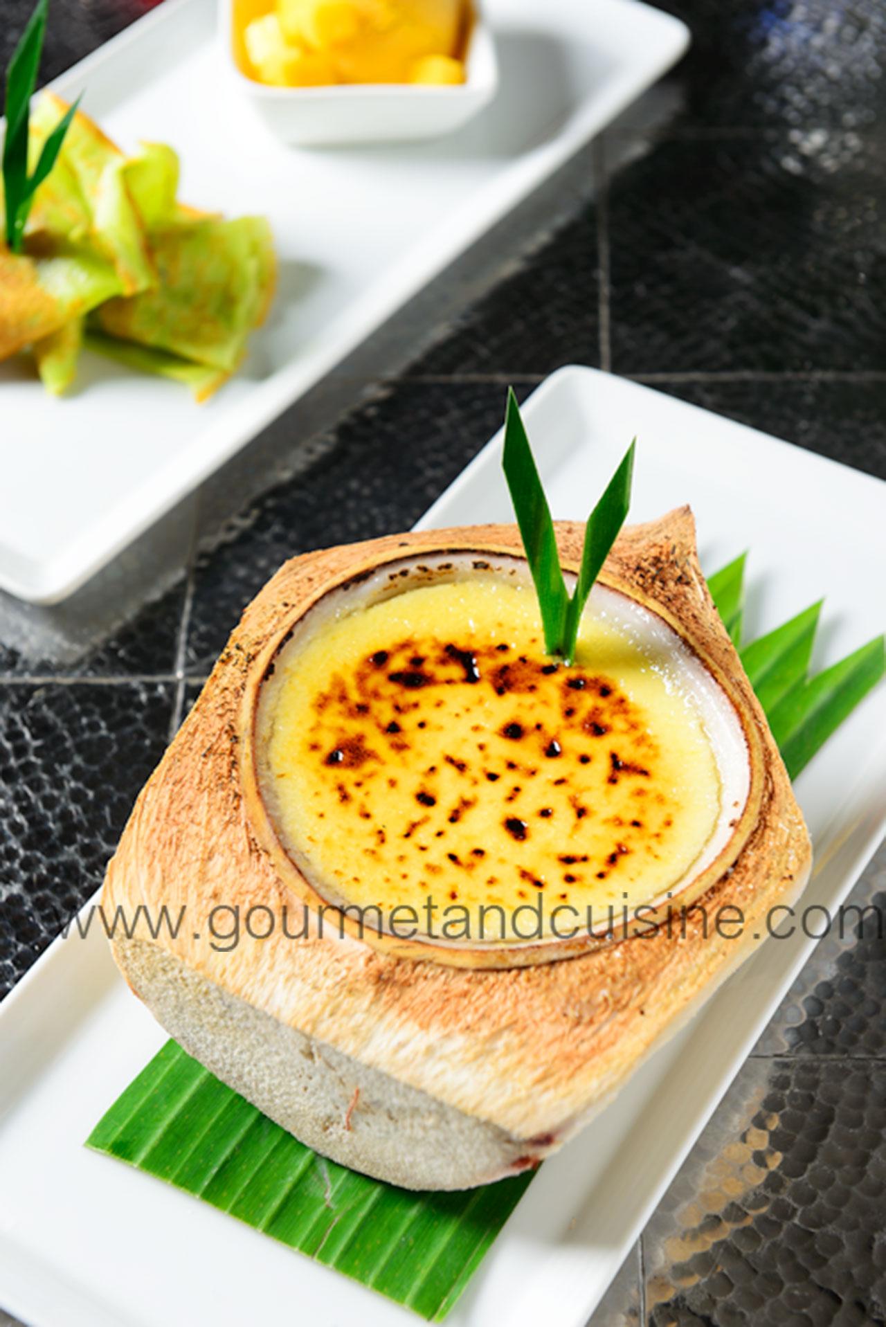 ลองเมนูอาหารคาวครบแล้วมาปิดท้ายด้วยของหวาน เครปใบเตย ไอศกรีมมะม่วงกับเครปใบเตยห่อมะพร้าวเชื่อม และแครมบรูเลมะพร้าวอ่อน มาในกะลาที่มีเนื้อมะพร้าวอ่อน ขูดกินง่ายและเนื้อนุ่ม