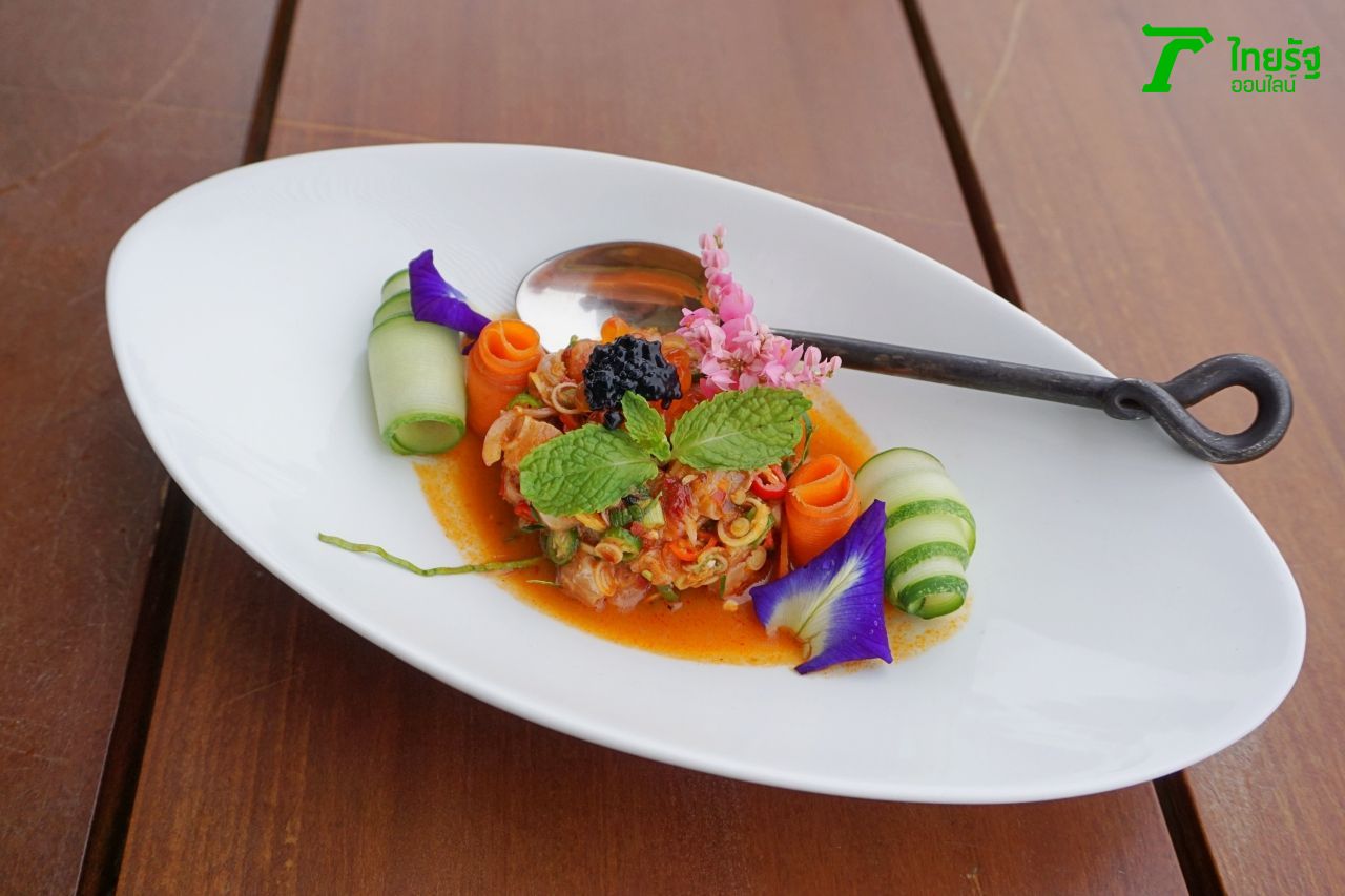มาถึงจานที่สาวๆ เป็นต้องปลื้มปริ่มแน่ๆ นั่นคือ พล่าแซลมอน แซลมอนสดๆ หั่นชิ้นลูกเต๋าพอดีคำ ปรุงด้วยน้ำพล่าแซ่บๆ รสจัดจ้าน หอมเครื่องสมุนไพรไทยอย่างตะไคร้ซอย ใบมะกรูดซอย หอมแดงซอย ใบสะระแหน่สด เพิ่มความหรูหราฟู่ฟ่าด้วยท็อปปิ้งเป็นไข่ปลาแซลมอนและคาร์เวียร์ให้อีก โอ๊ย...เริด! จานนี้ถูกใจสายแซ่บแน่นอน